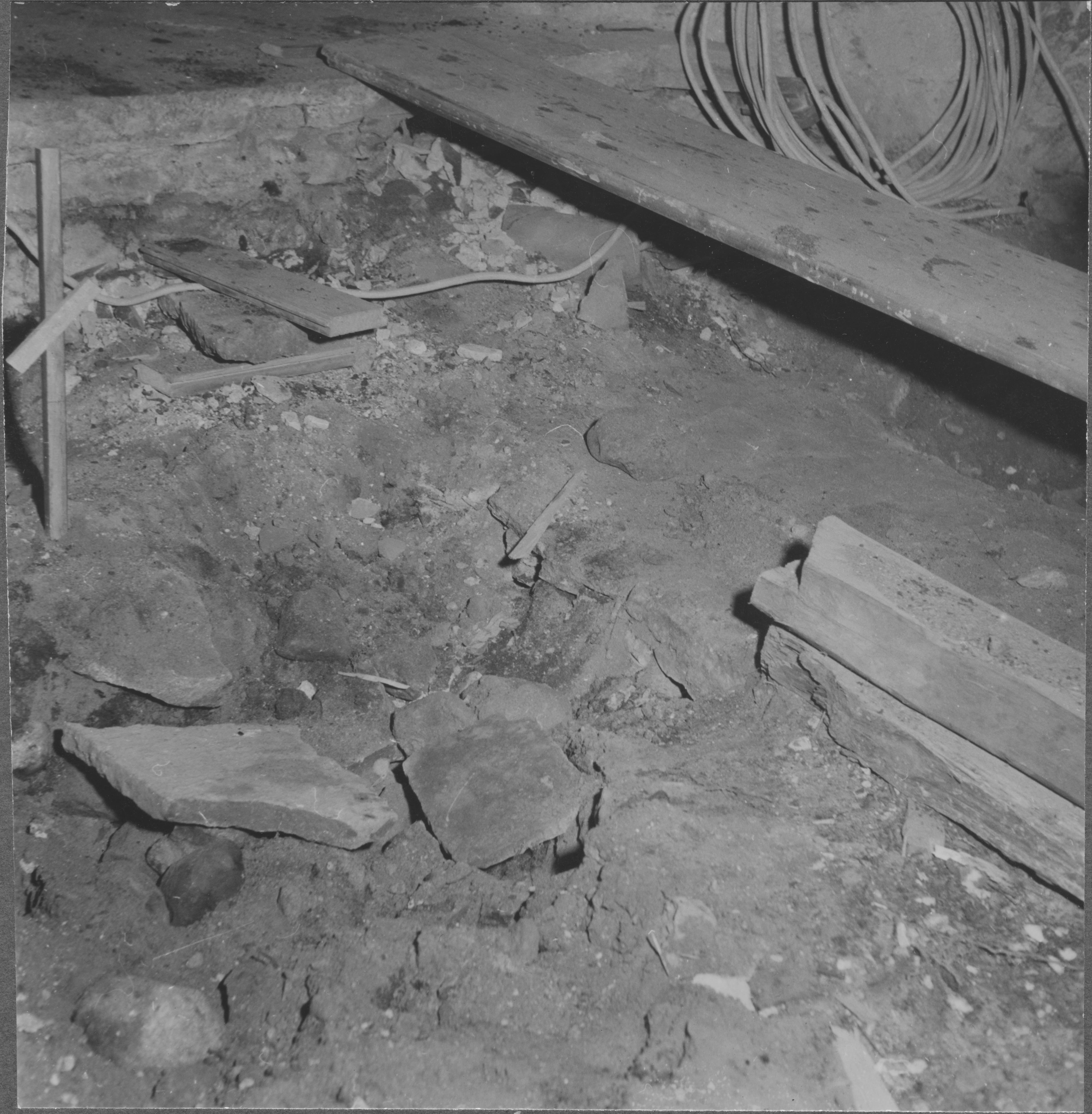 Beskrivning: Romanska kyrkans grundmur till norra långhusmuren intill västra muren.