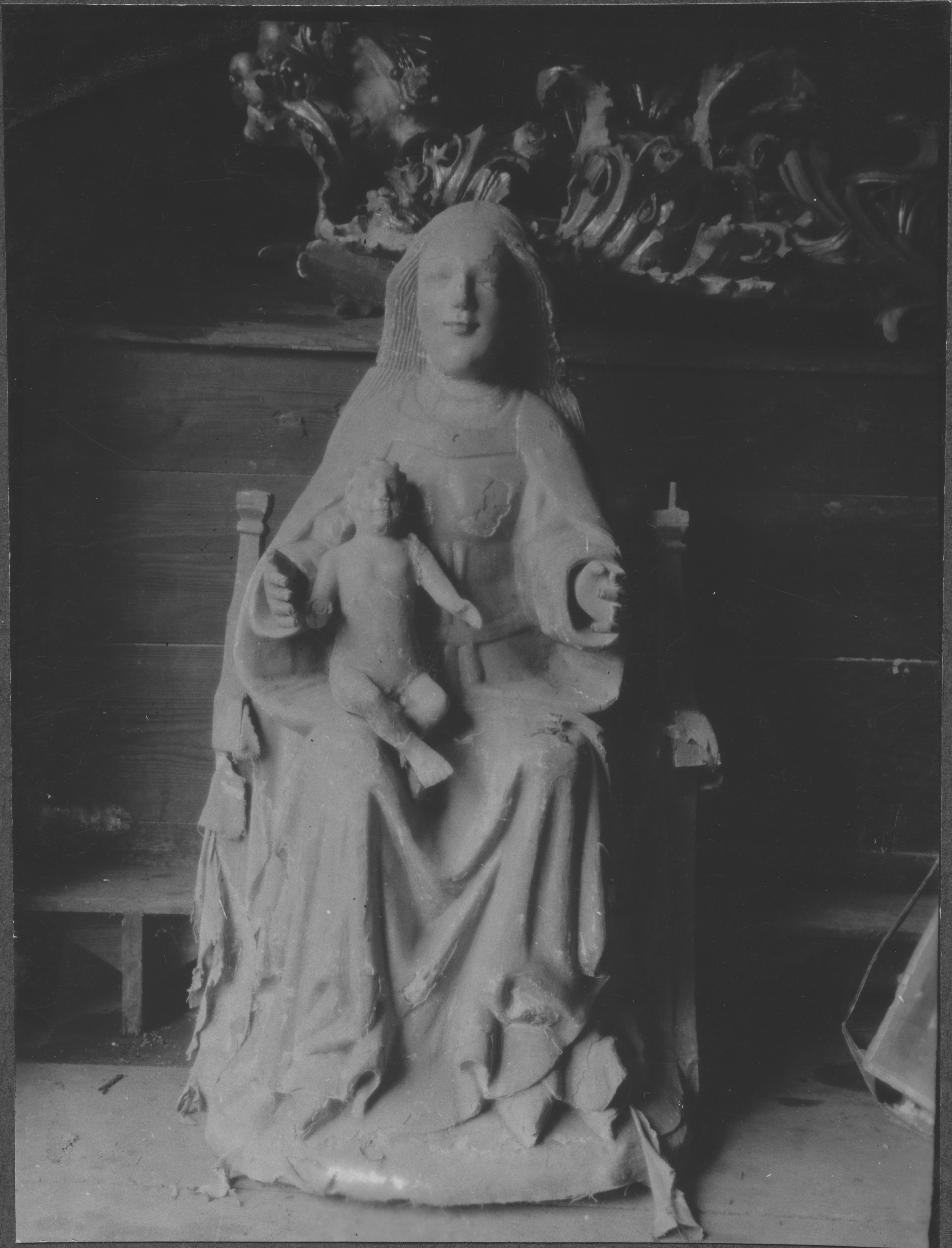 Beskrivning: Träskulptur av skulpterat, krederat och målat trä föreställande madonna sittande med barnet i knät. Medeltiden.
