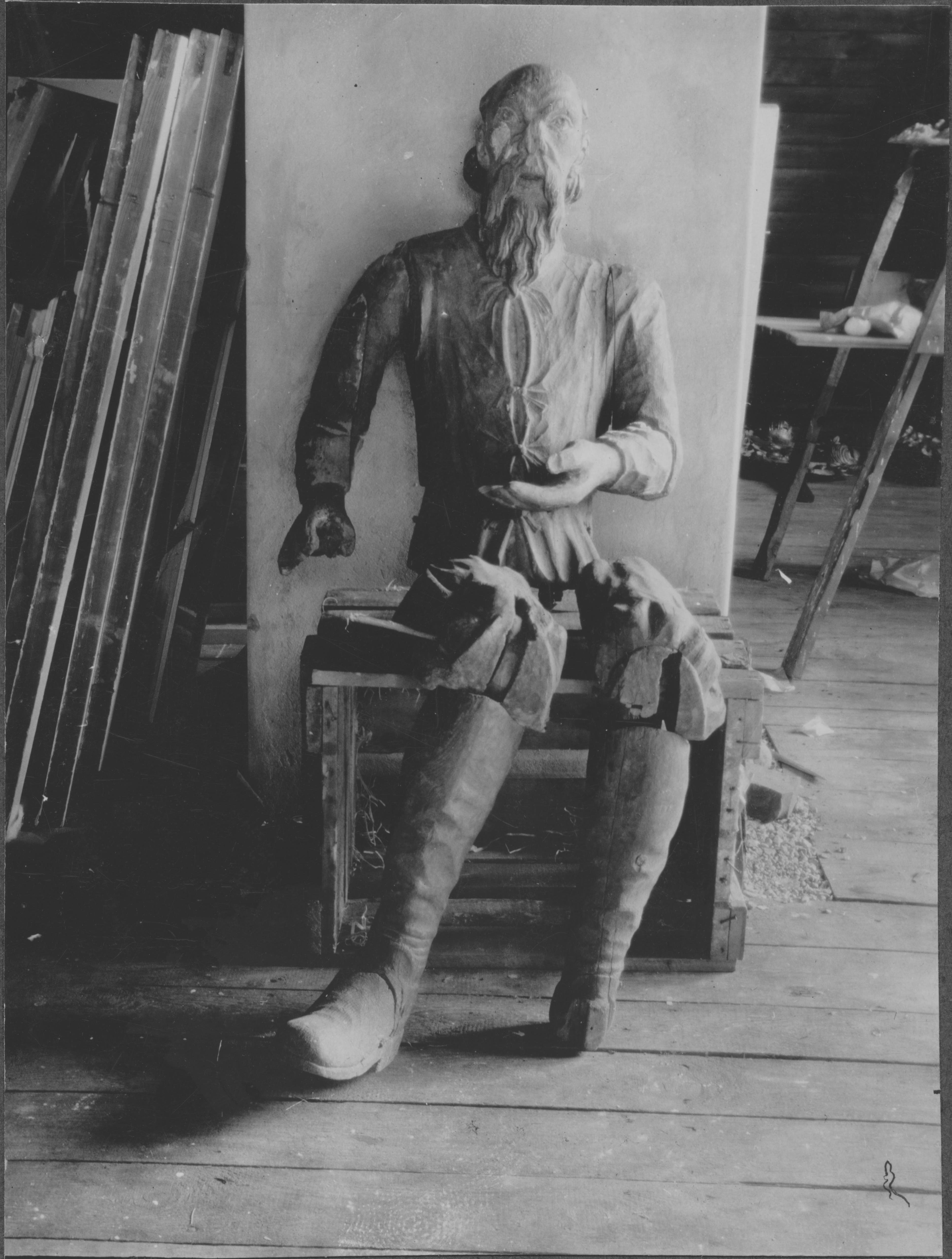 Beskrivning: Träskulptur föreställande "Allmoseman". Armar och ben ledade.
