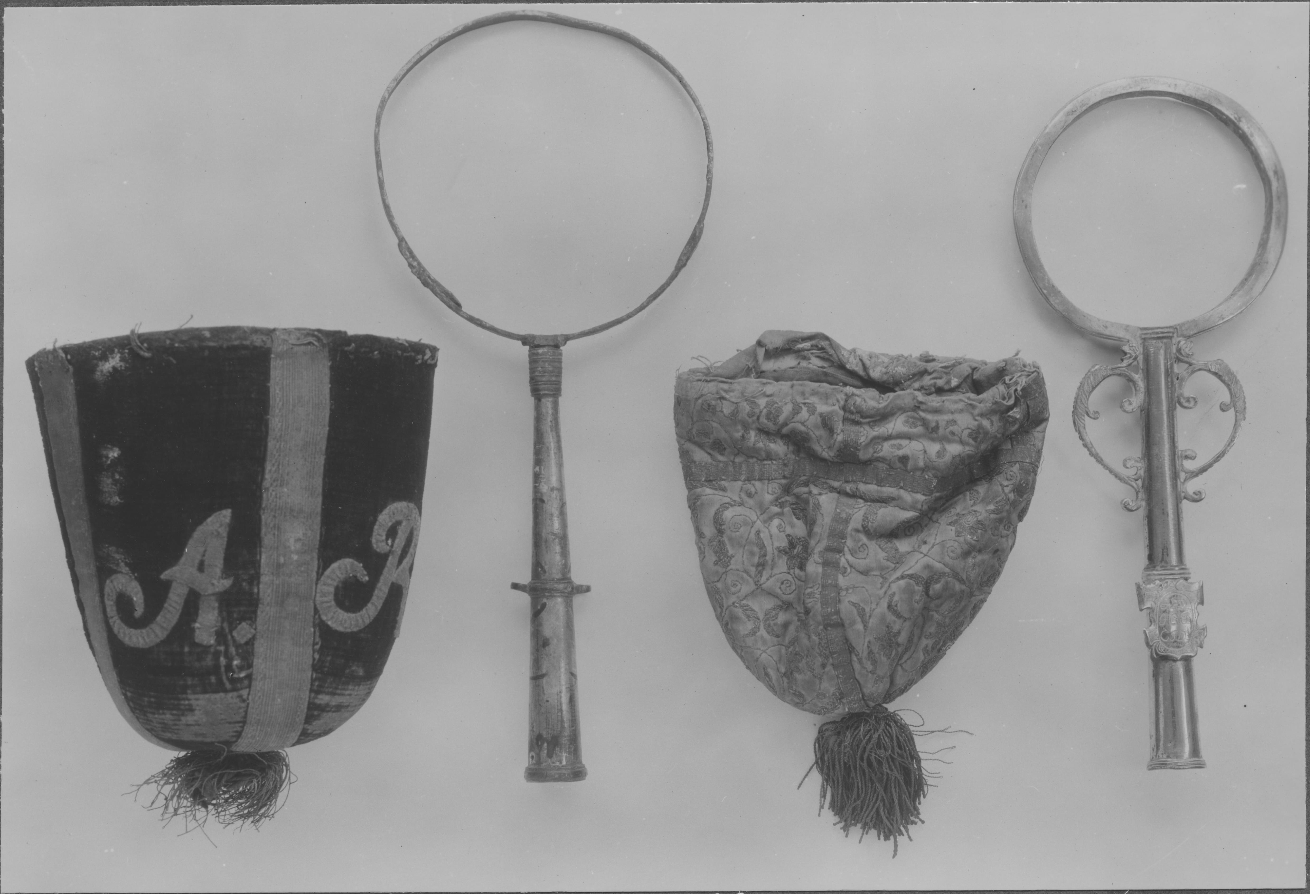 Beskrivning: Två stycken håvar och skaft. Broderade med A.R. respektive med bladslingor. Pietas 3533-3534/1957. Före konservering.