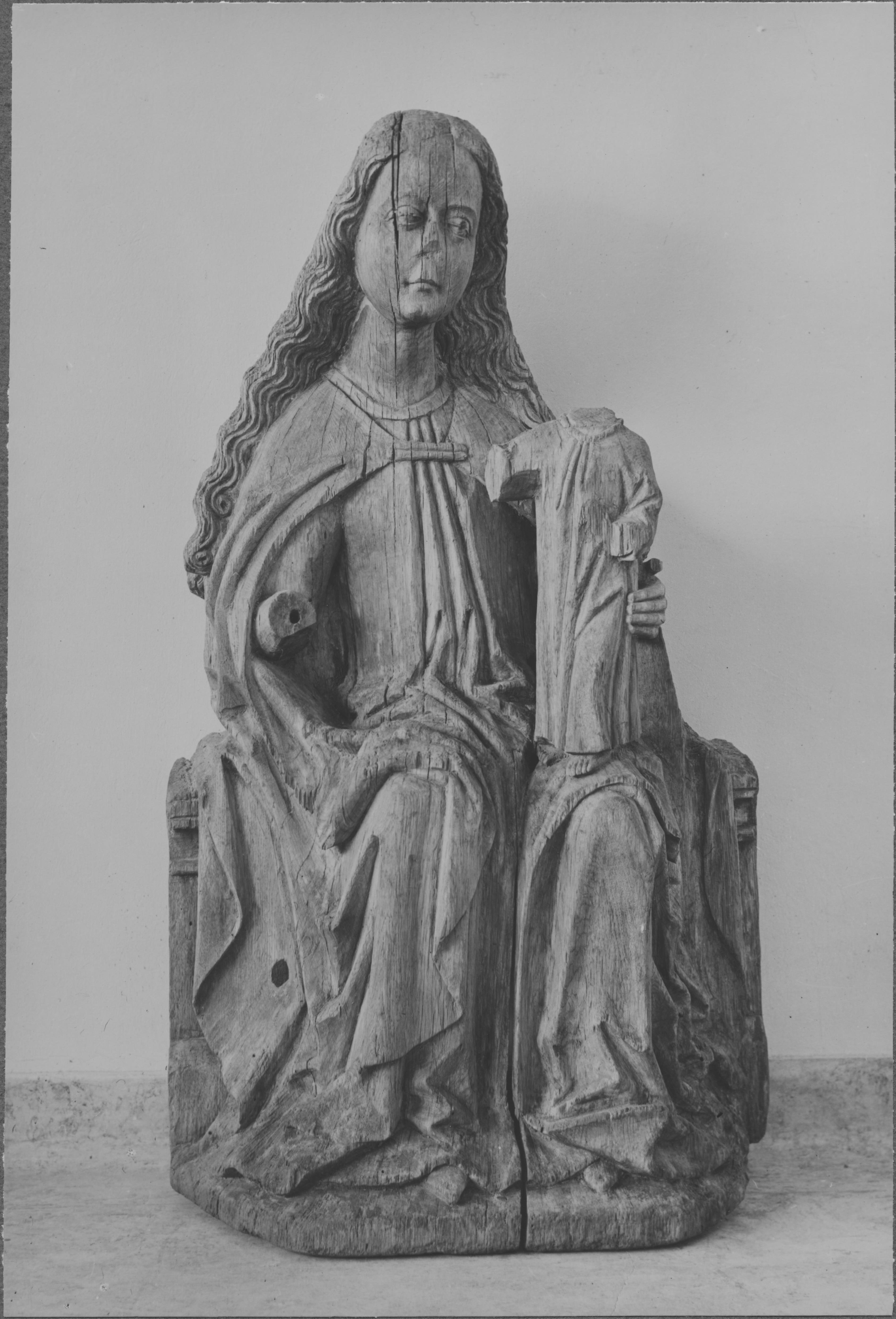 Beskrivning: Madonnabild av trä med barnet på vänster knä. 1400-talets förra hälft.