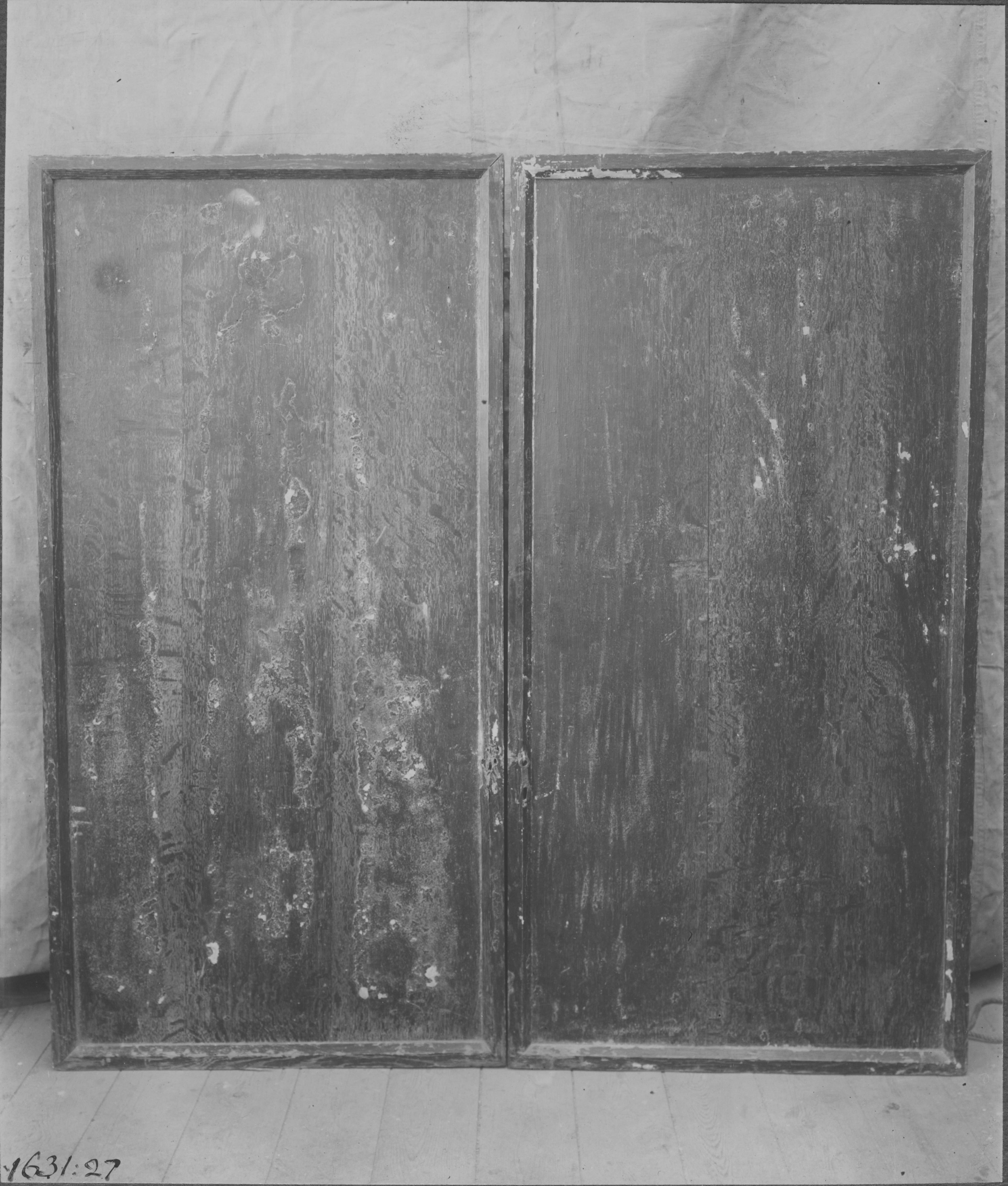 Beskrivning: Baksida på altarskåp. Före konservering 1931 av Sven Sundbaum.