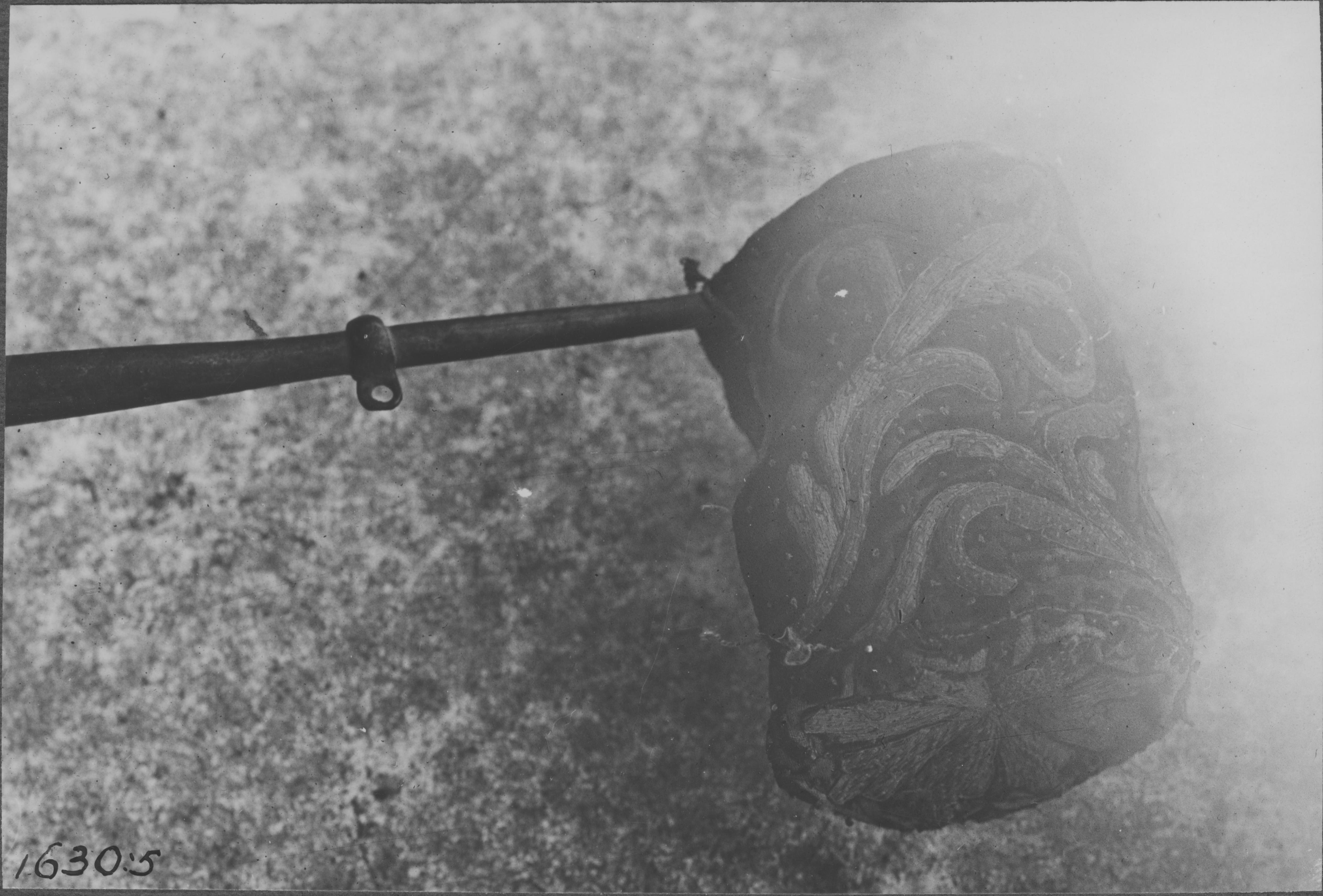 Beskrivning: Håv av svart sammet med broderier i hög relief. 1695.