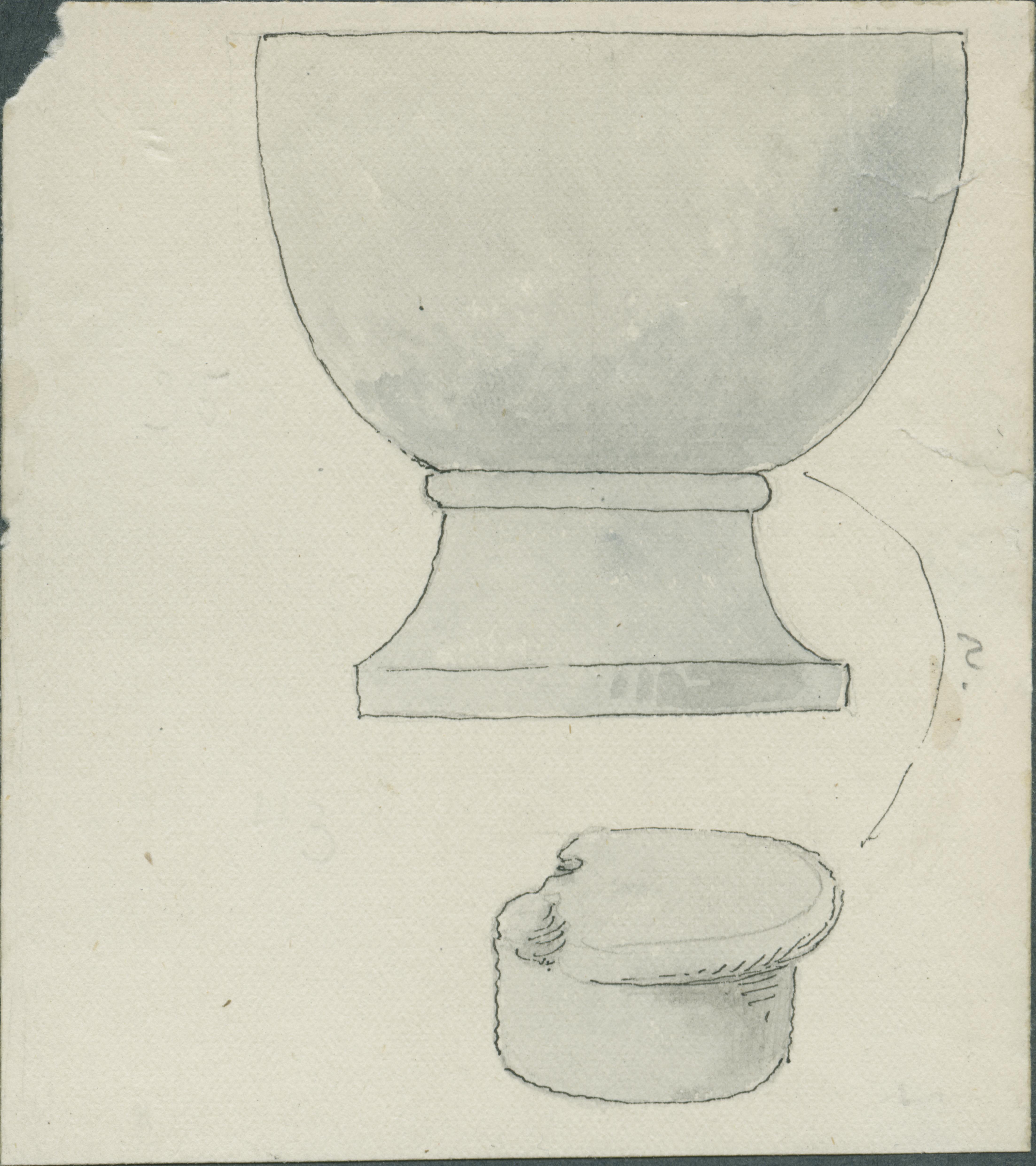 Beskrivning: Dopfunt av sandsten. Oornerad. 1200-talet. Teckning 1900 av Olof Sörling.