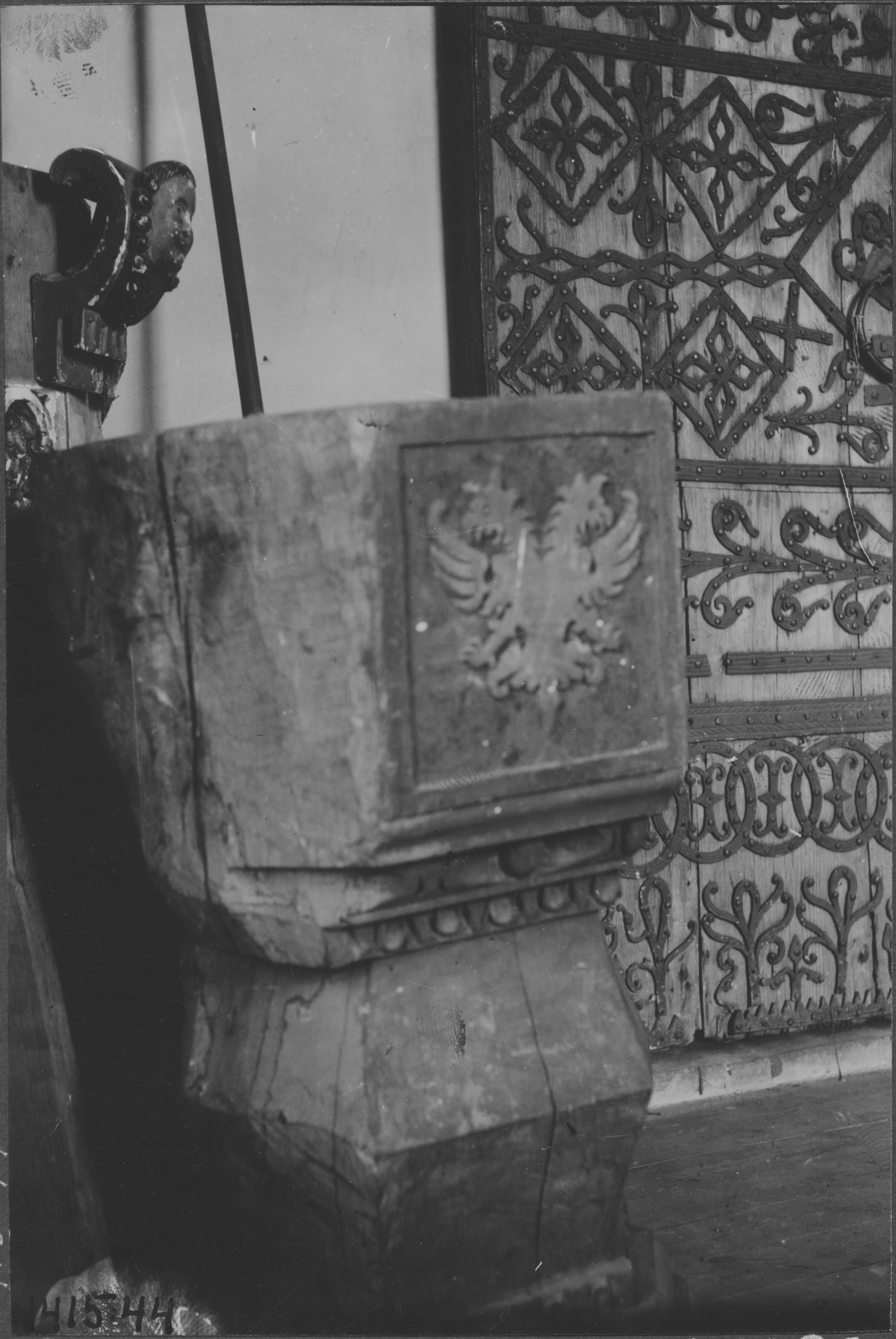 Beskrivning: Dopfunt av trä med orneringar i form av djur. Sexkantig. 1669.