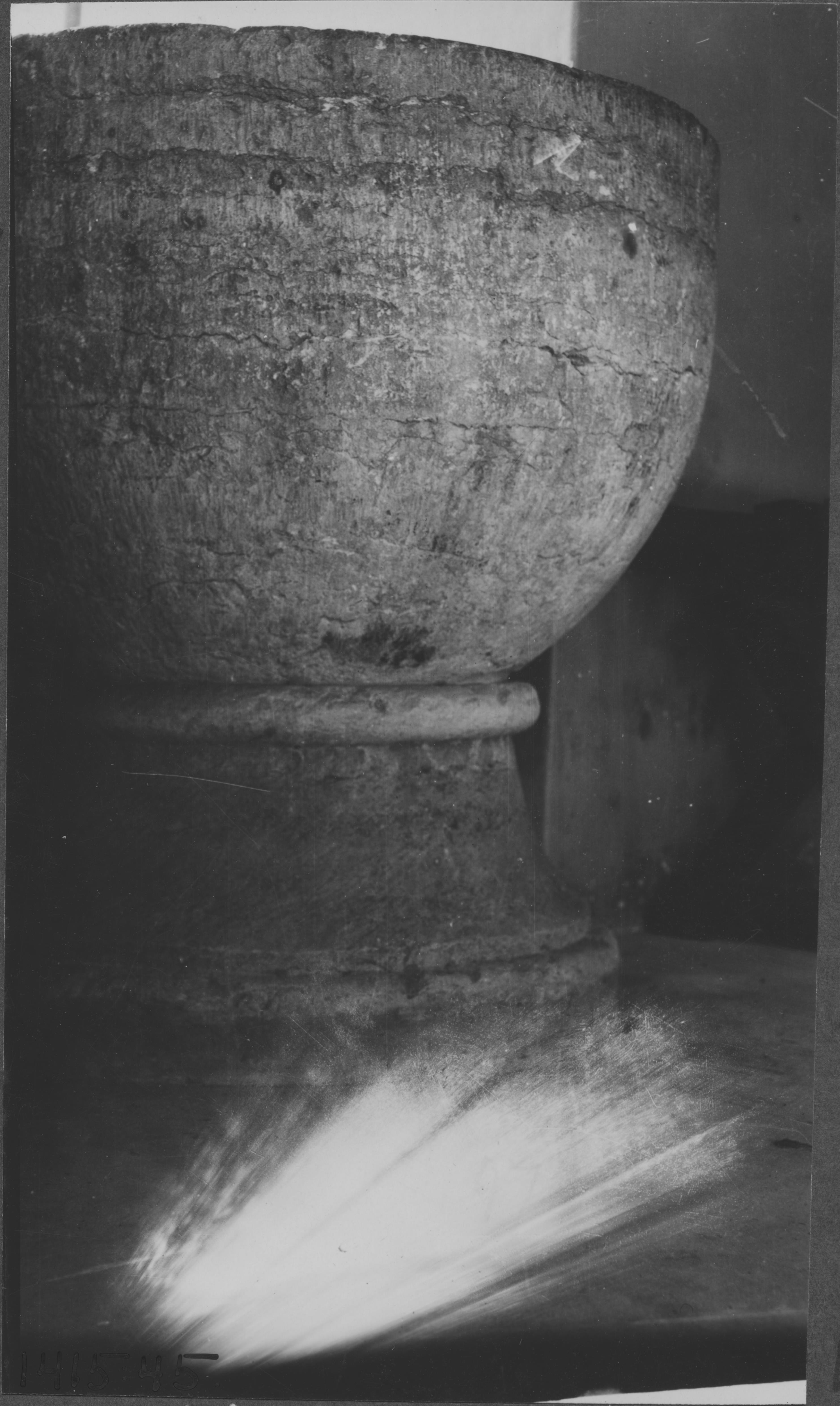 Beskrivning: Dopfunt av sandsten. Oornerad. 1200-talet.