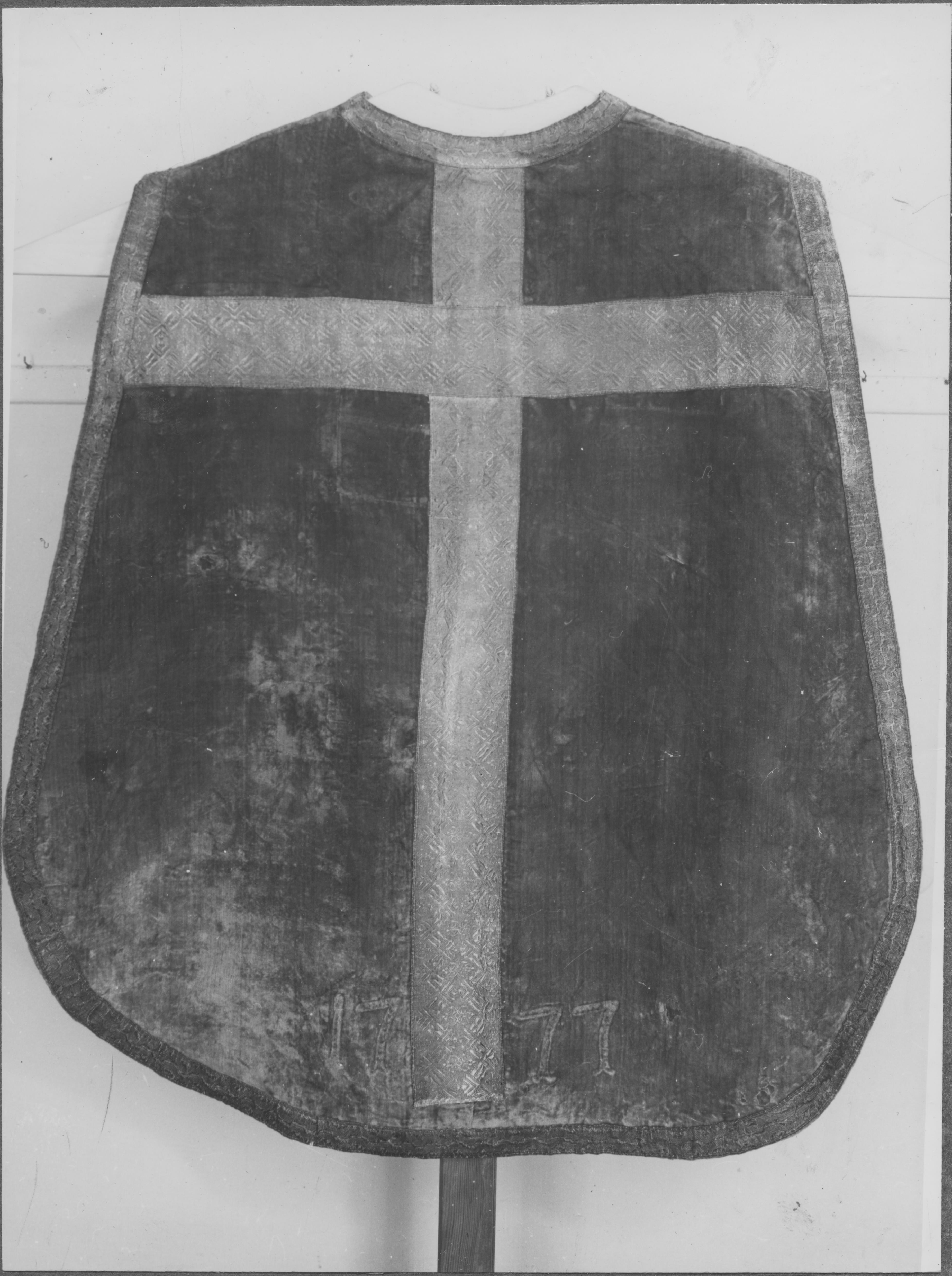 Beskrivning: Mässhake av gulbrun sammet med galoner och kors av silver. Ryggstycket. Genom blekning syns årtalet 1777.