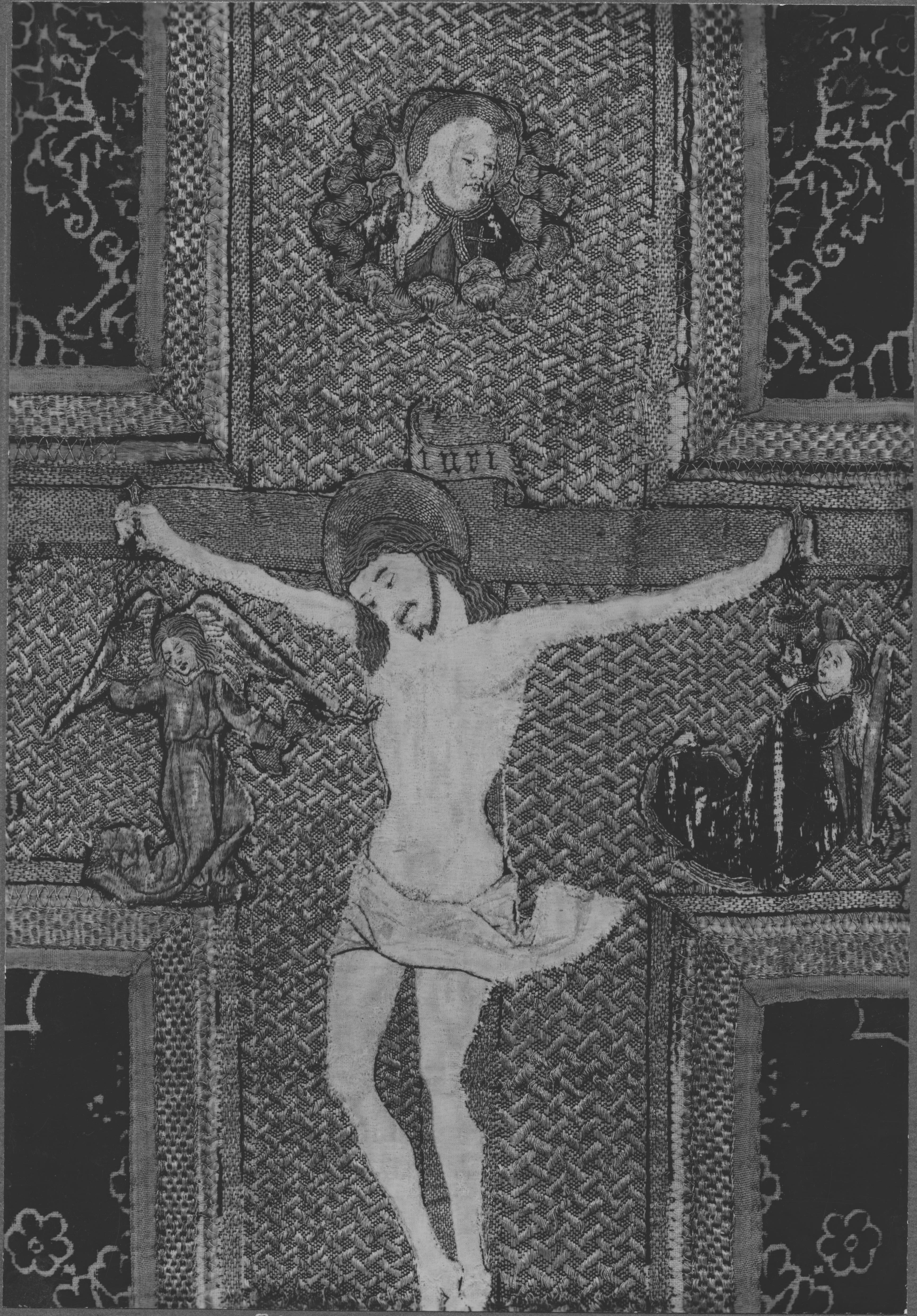 Beskrivning: Detalj av mässhake. Kristus på korset. Efter konservering.