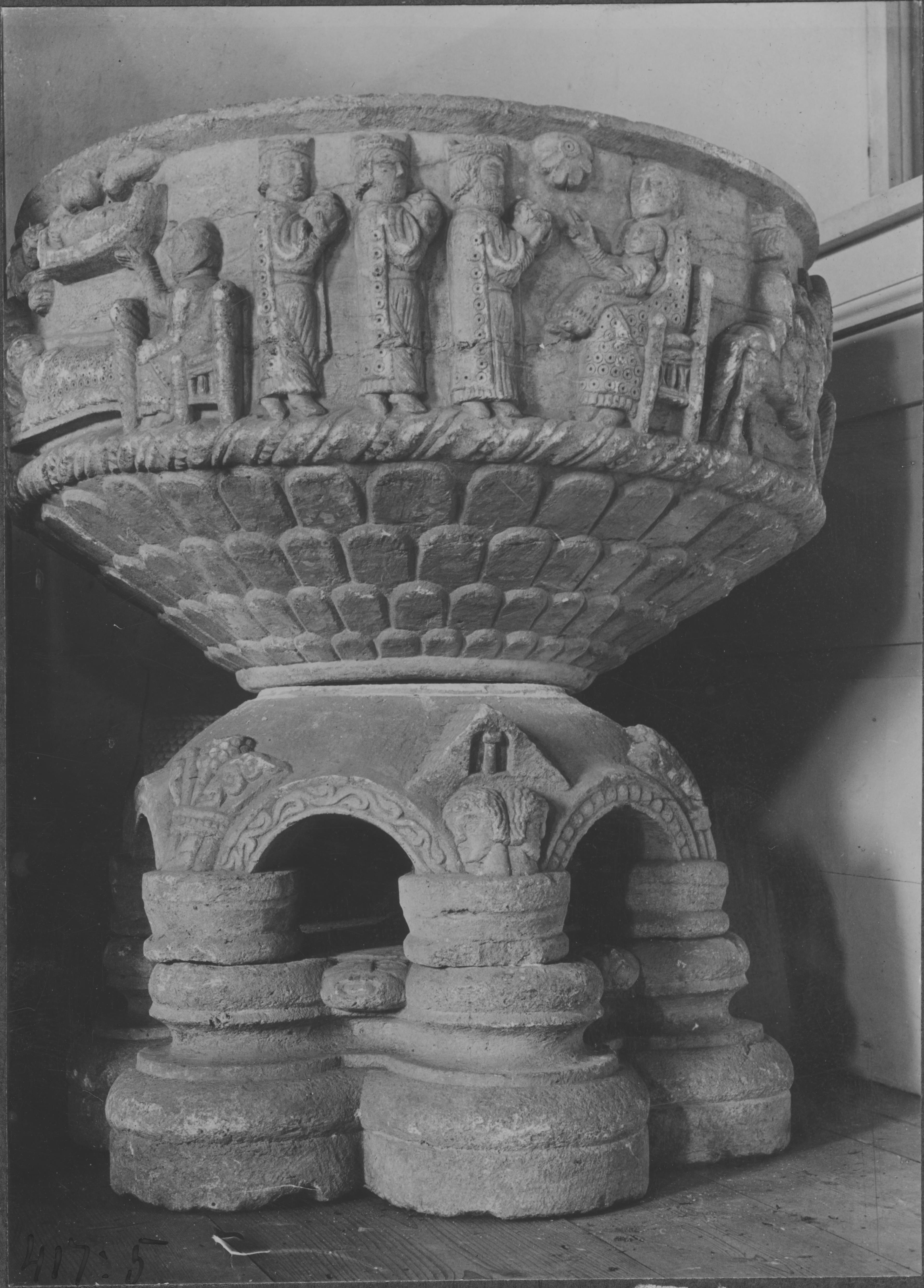 Beskrivning: Dopfunt av sandsten. Prydd med reliefframställningar av Jesu födelse och de tre konungarnas tillbedjan. från 1100-talet.