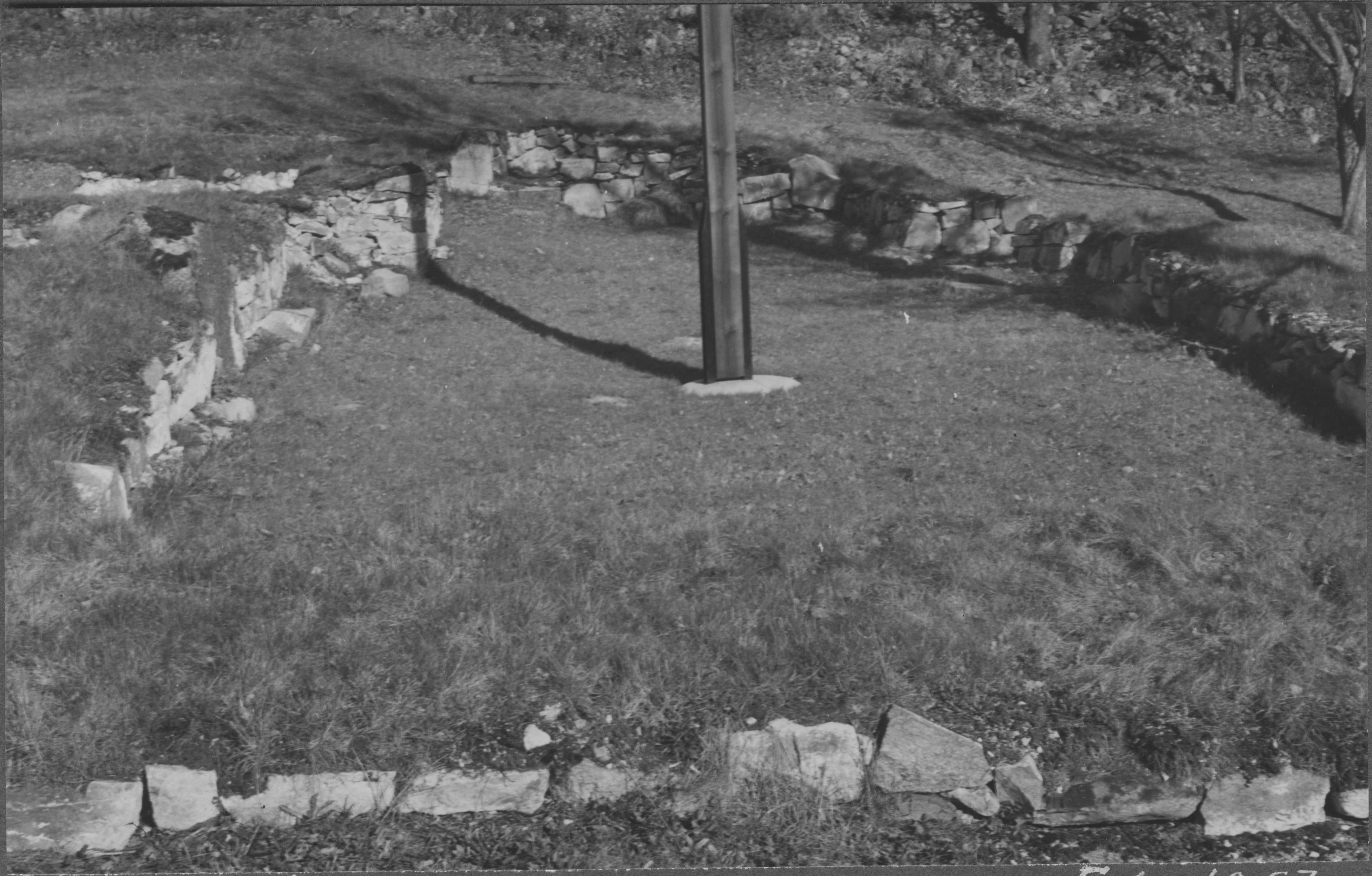 Beskrivning: Grundmurar till en gamla kyrkan efter utgrävning 1953-1954.
