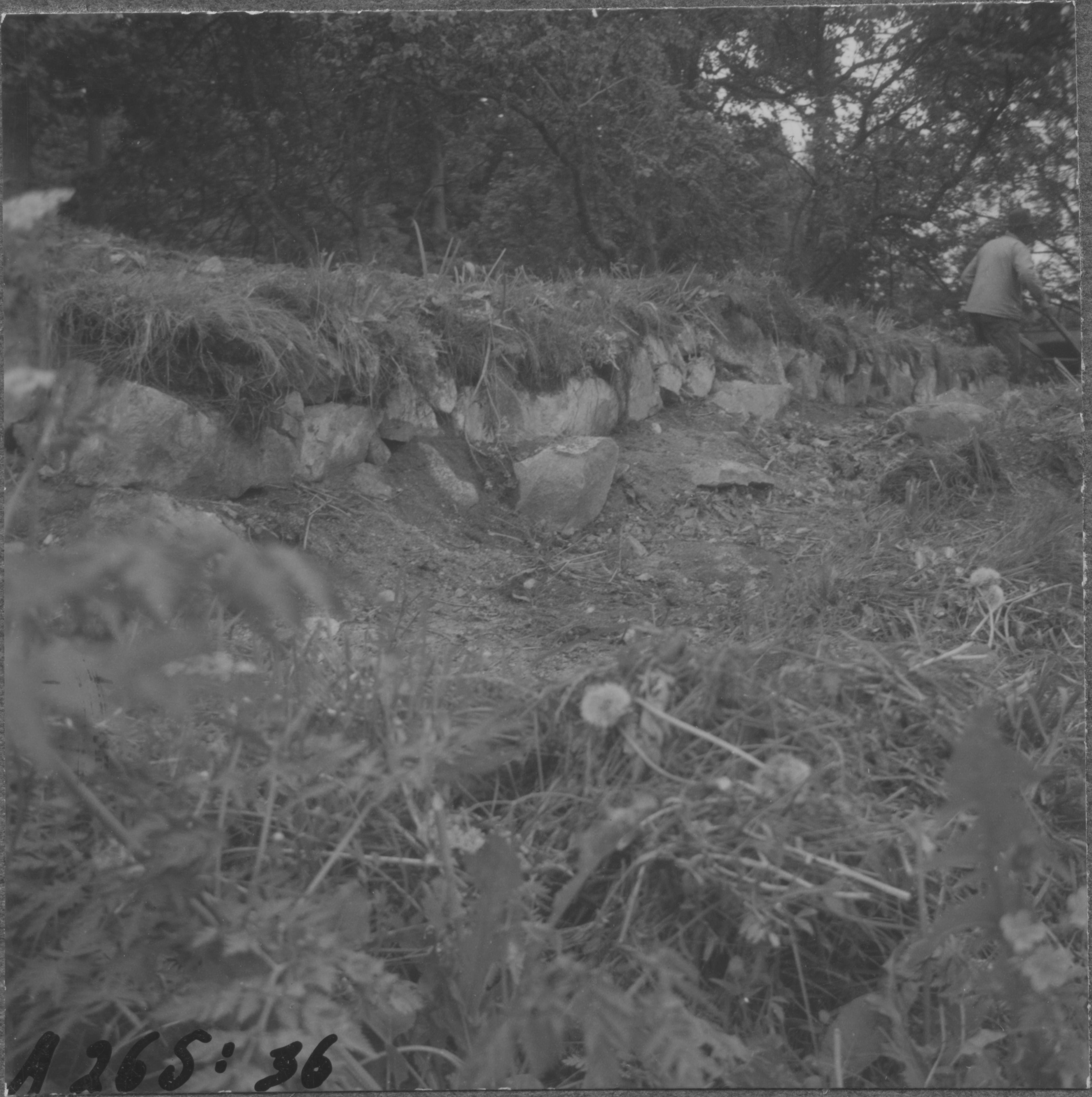 Beskrivning: Utgrävning 1953-1954 av murlämningar efter gamla kyrkan.