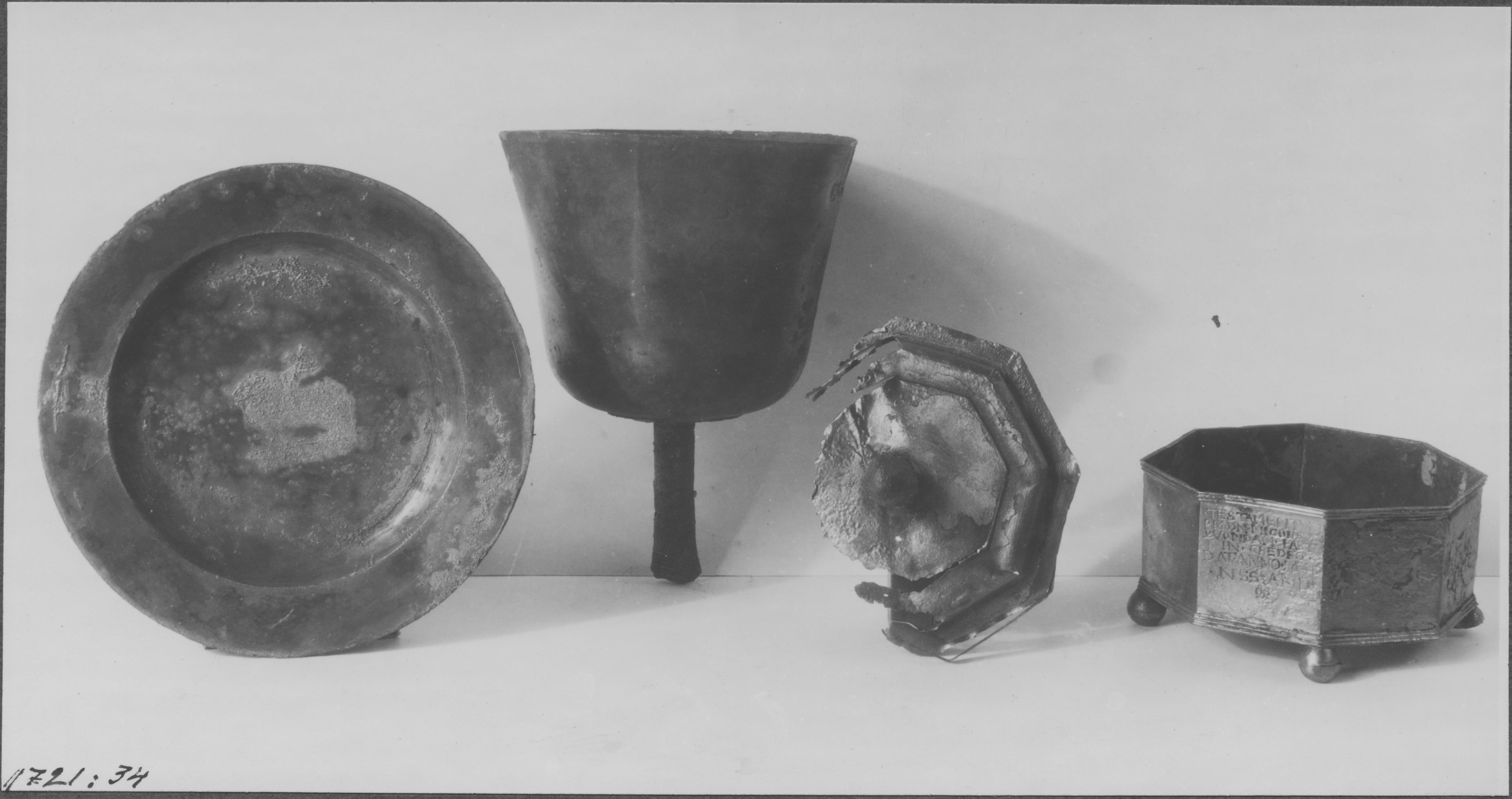 Beskrivning: Altarkärl stulna 1825, återfunna 1933 vid rensning av en brunn i Kalmar slott. Sveriges Kyrkor.