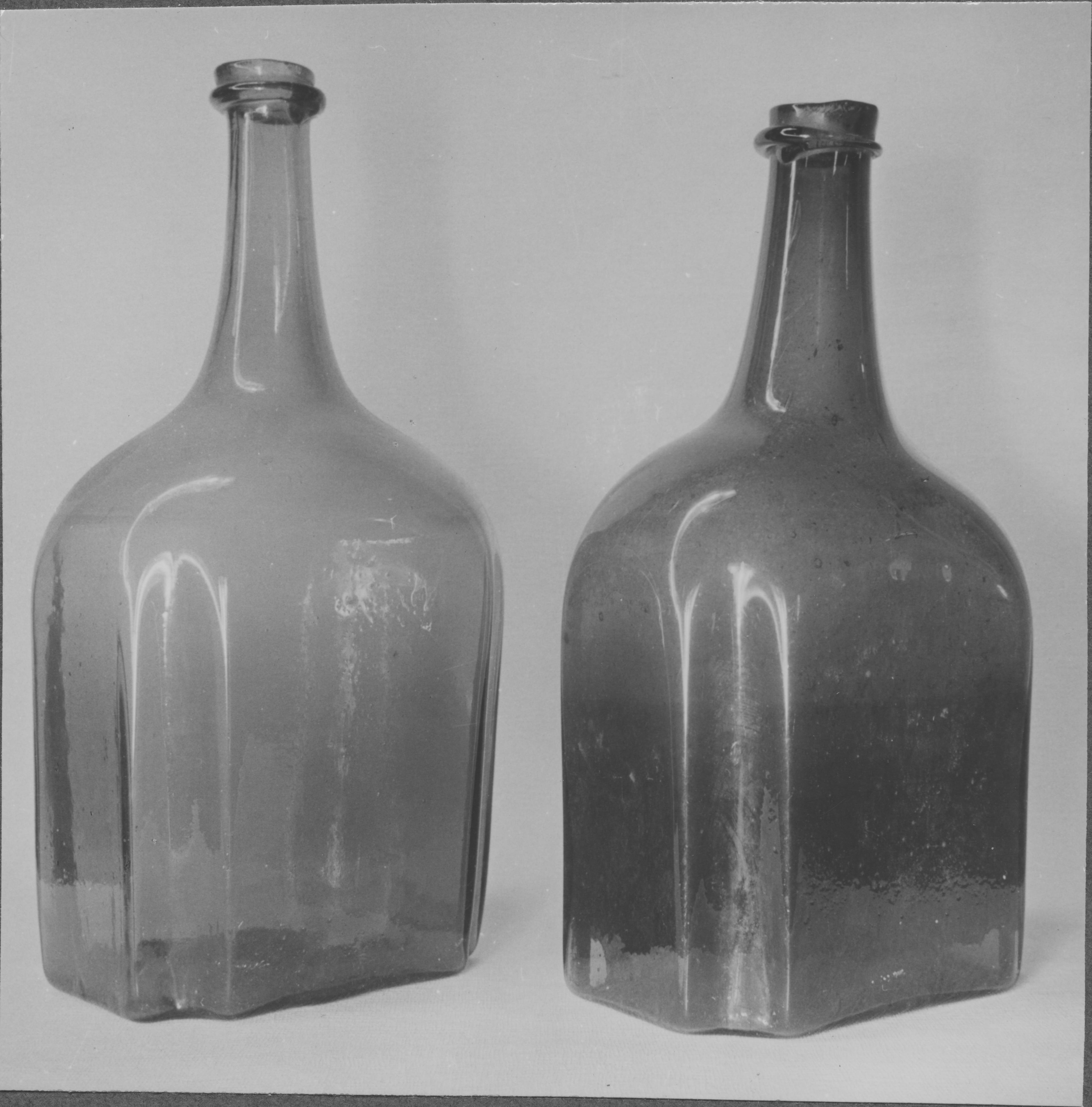 Beskrivning: Vinflaskor av glas. 1700-tal? Sveriges Kyrkor.