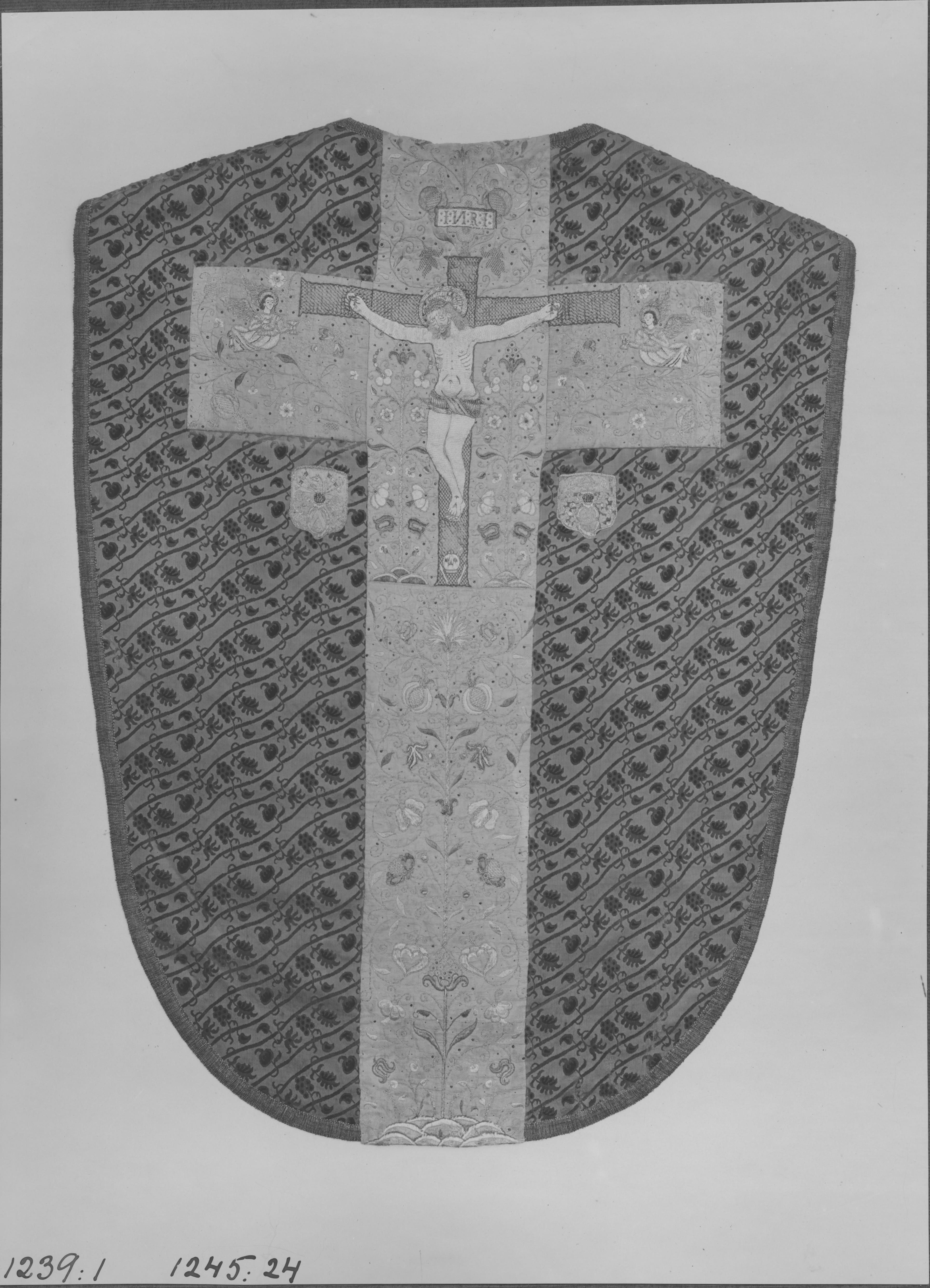 Beskrivning: Mässhake av röd sammet från 1632. Textilutställning i Stockholm 1929 nr 277.