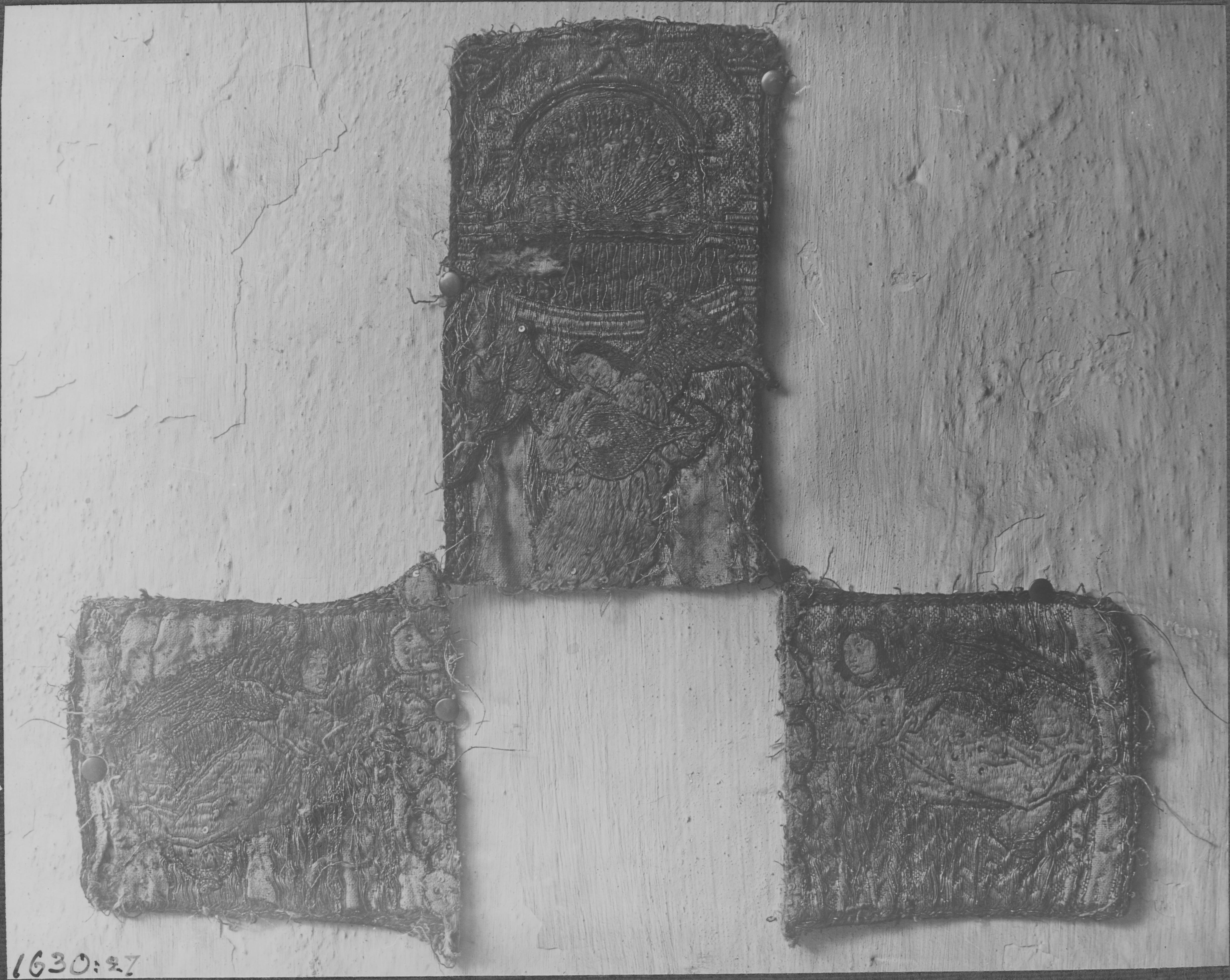 Beskrivning: Detalj av broderat kors från mässhake. Flandriskt arbete från senmedeltiden.