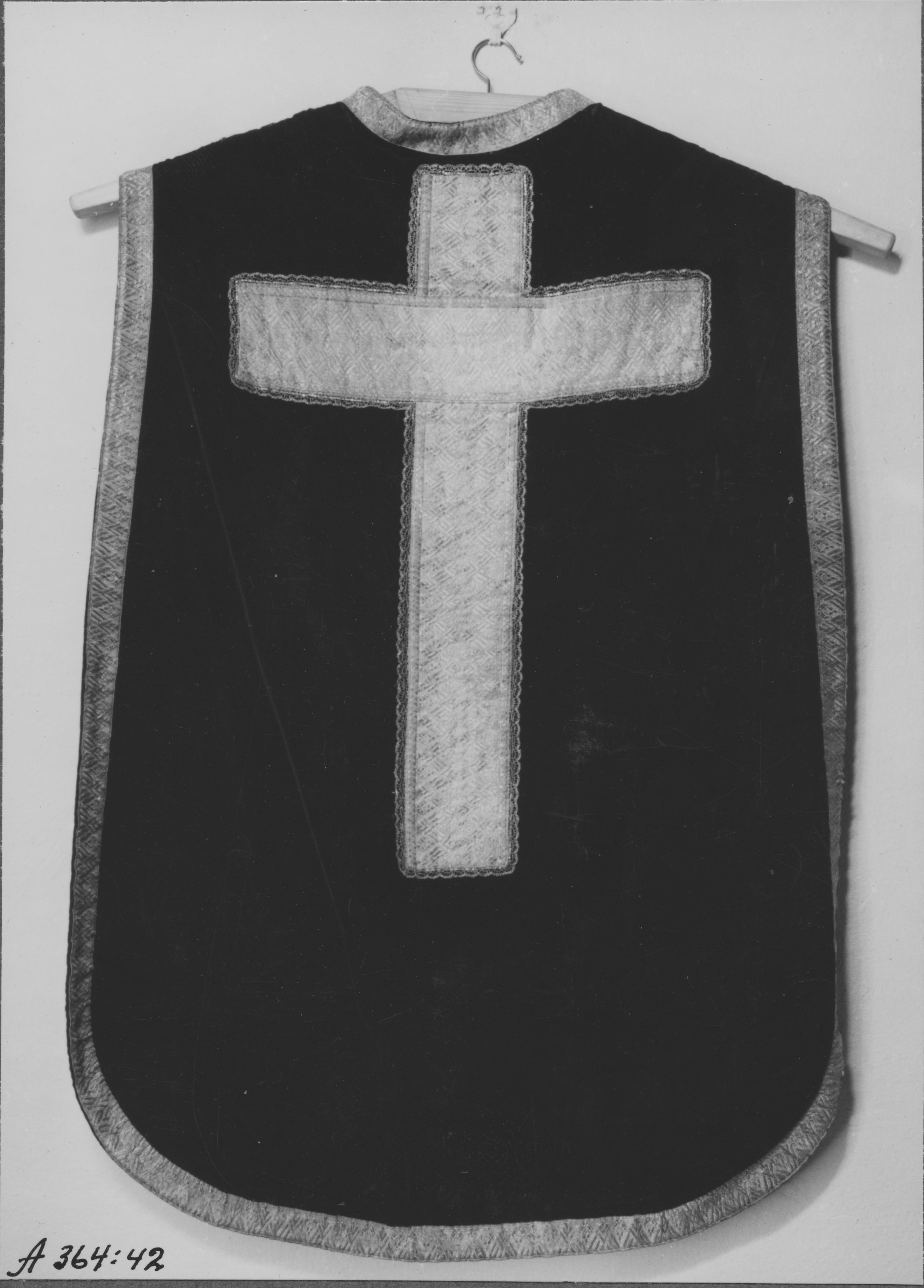 Beskrivning: Bakstycket på mässhake med galon och kors i silver. Från 1786. Sveriges Kyrkor.