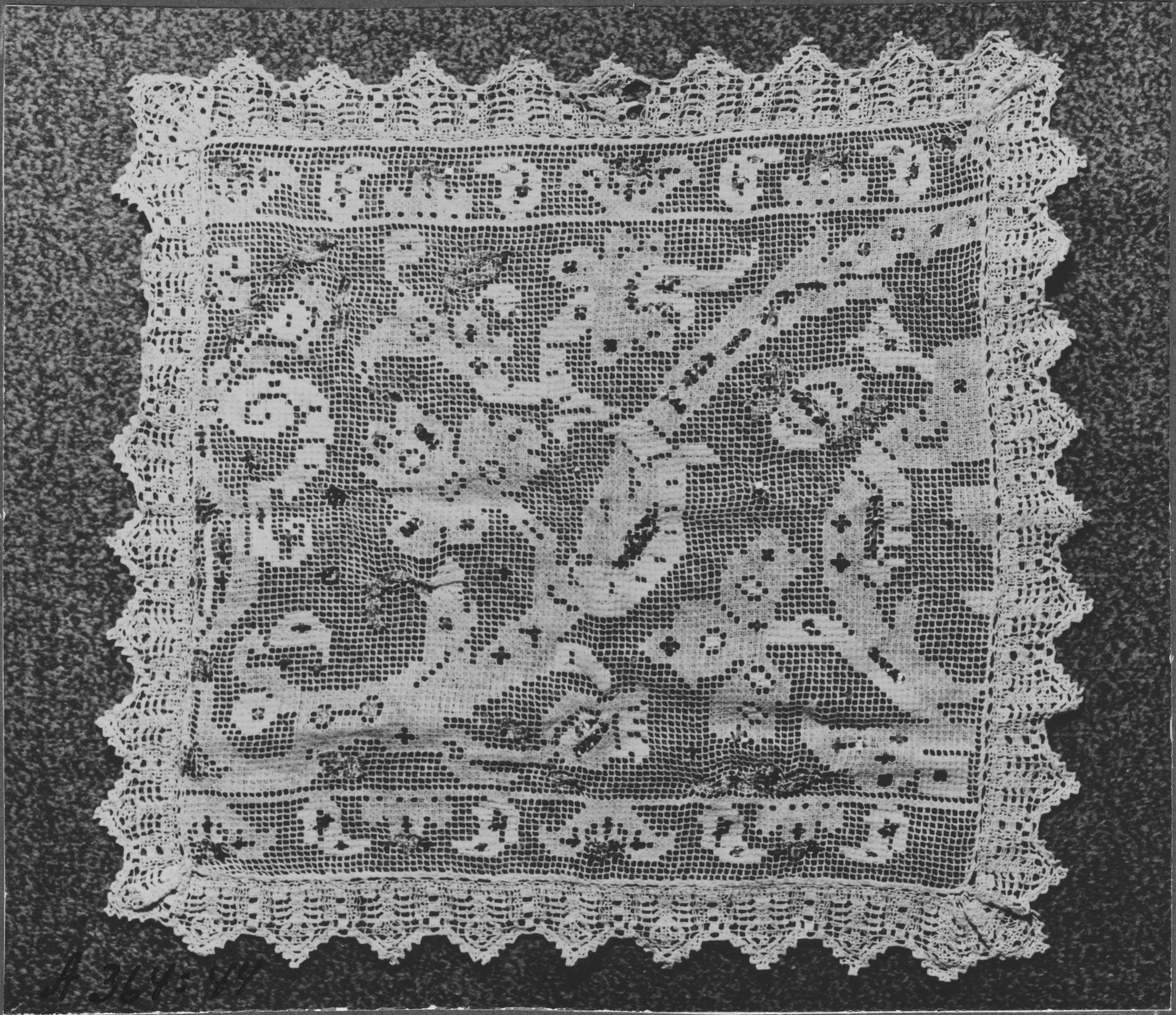 Beskrivning: Kalkduk av vitt filetarbete. 1600-tal. Sveriges Kyrkor.