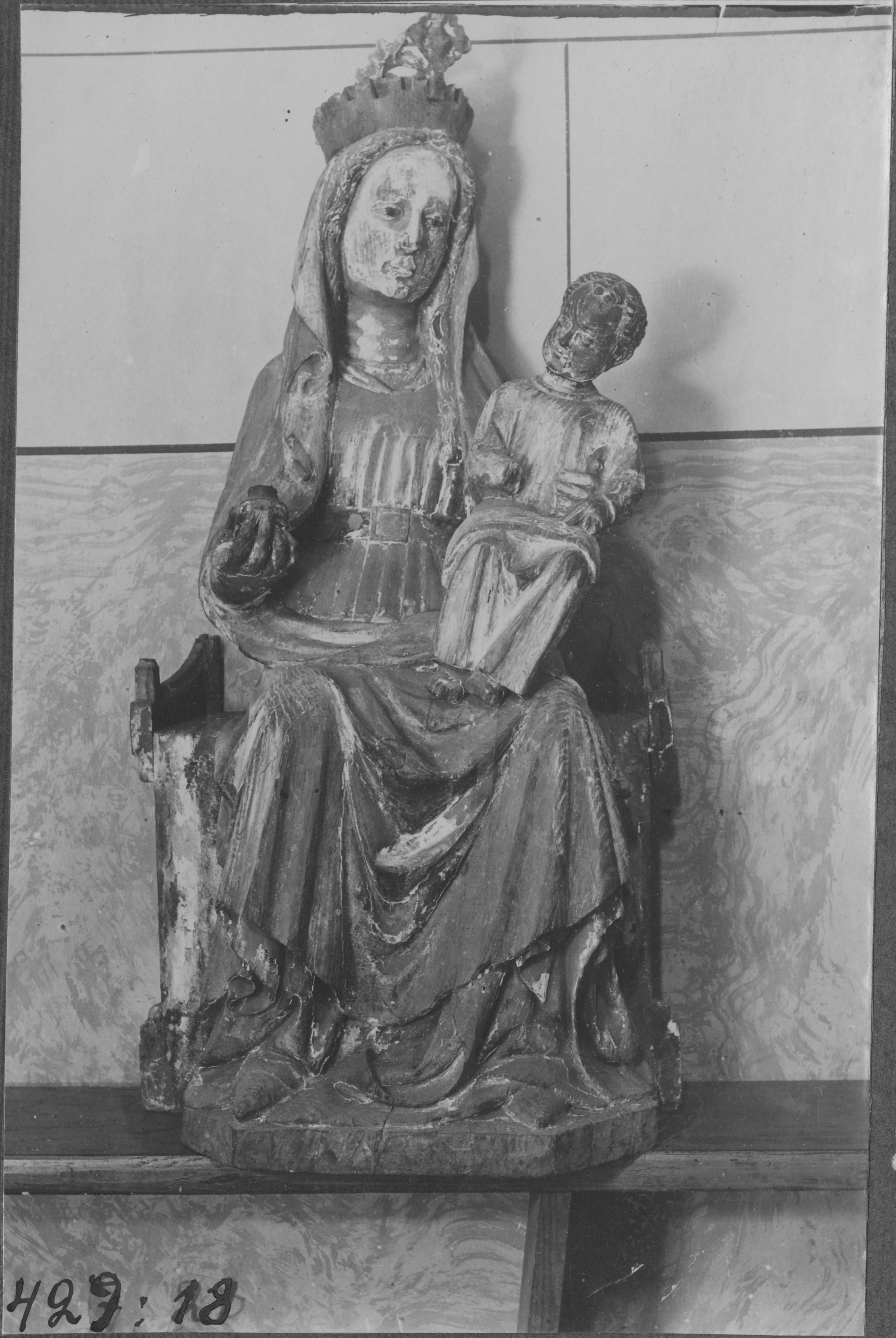 Beskrivning: Träskulptur föreställande madonna med barnet. I handen håller hon en skål. 1400-talet.