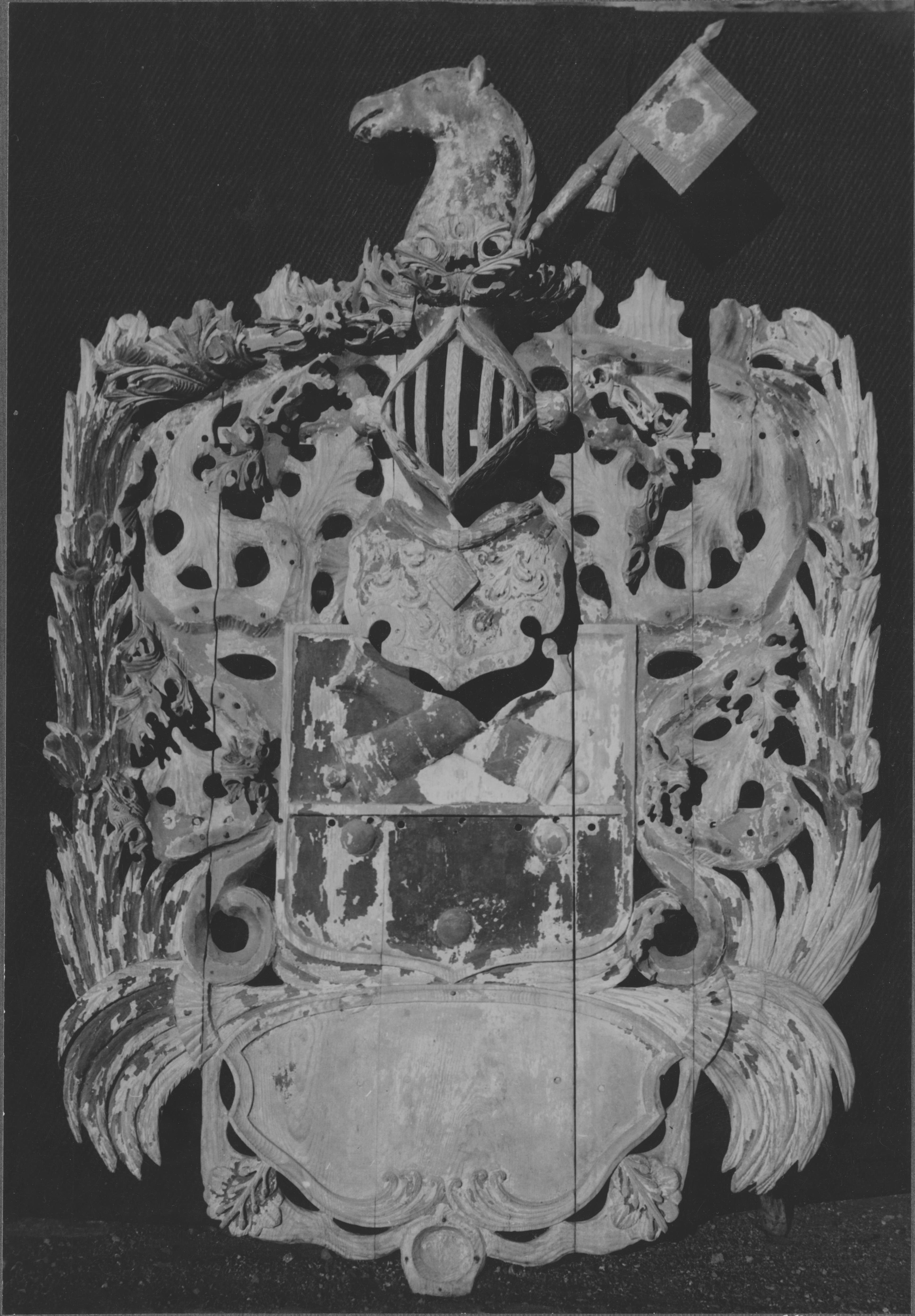 Beskrivning: Begravningsvapen för Berthold Schultzendorff. Före konservering.