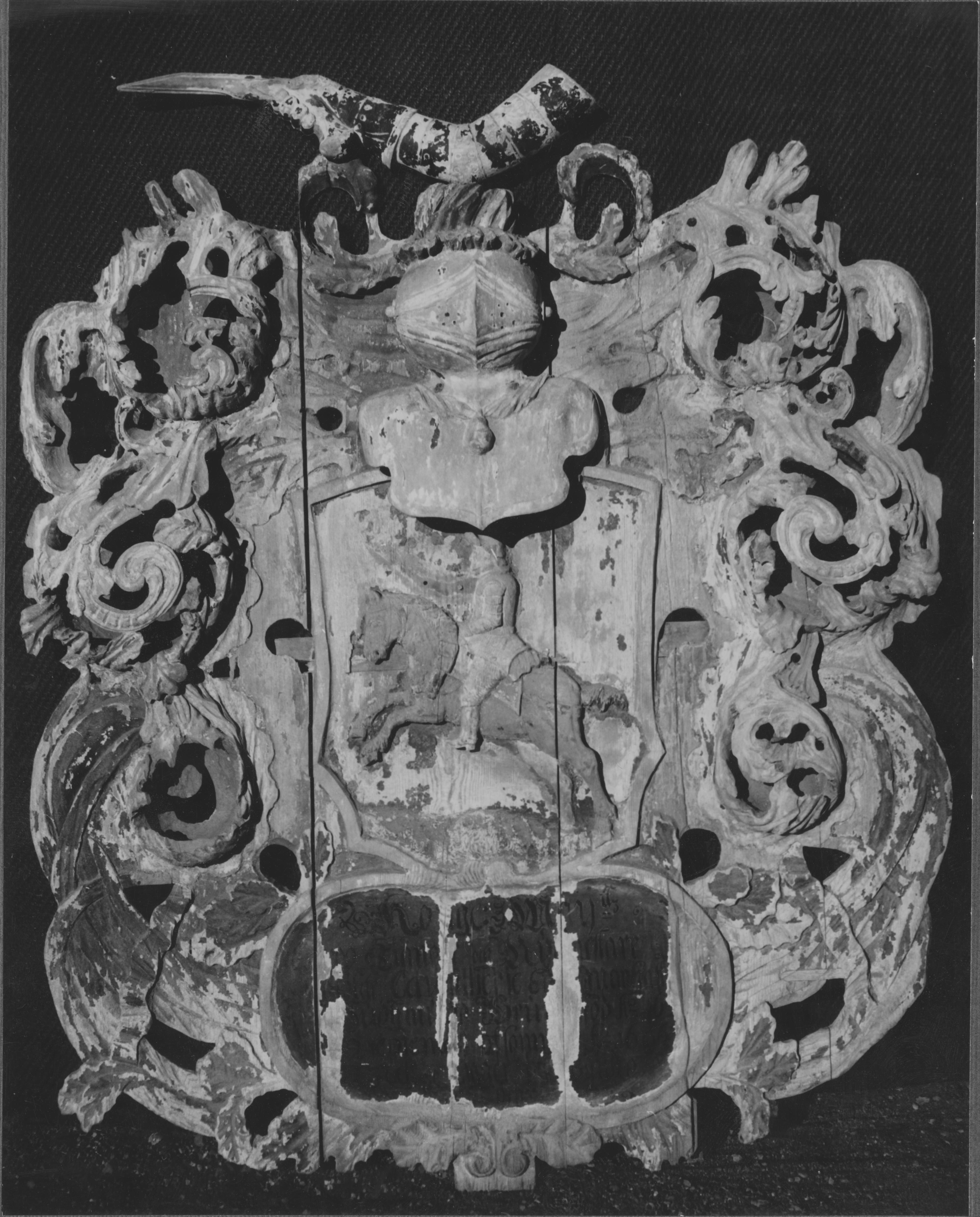 Beskrivning: Begravningsvapen för Gudmund Bruun från 1626. Före konservering.