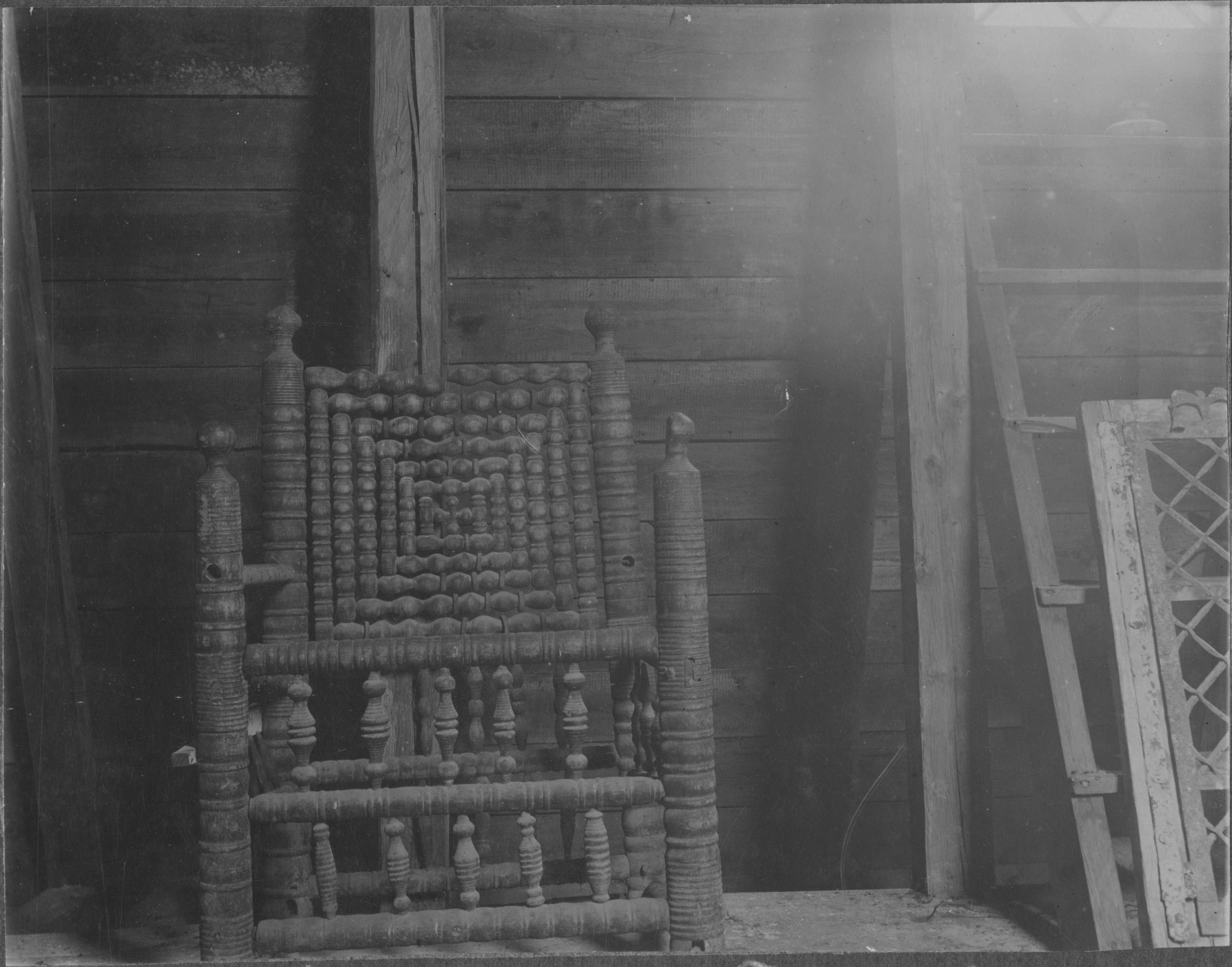 Beskrivning: Stol av ek. Högmedeltid. Norrköpings Utställning 1906. Från kyrkomuseet.