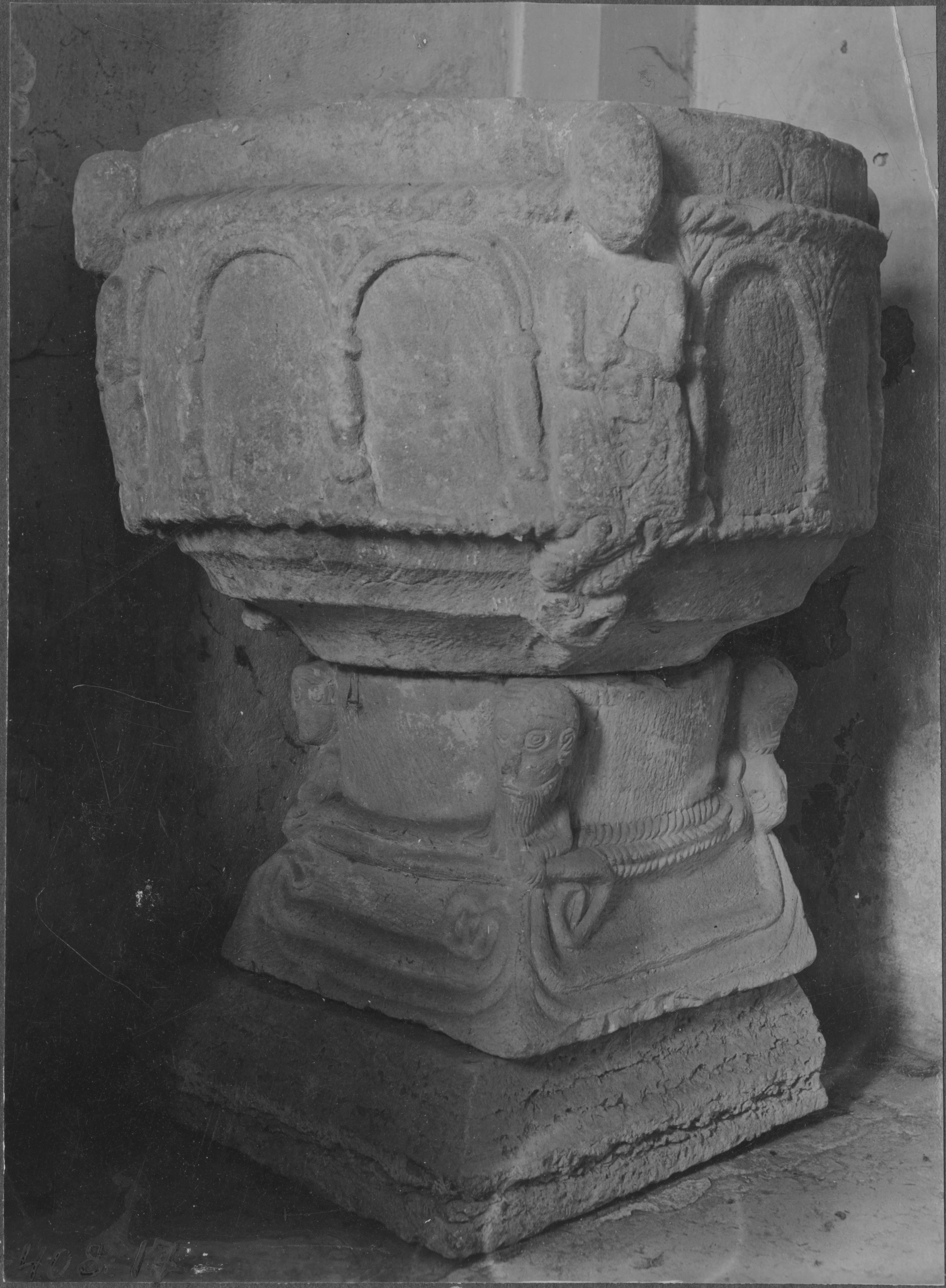 Beskrivning: Dopfunt av sandsten. Rundbågiga arkader och fyra hörnfigurer. Foten med hörnfigurer och drakar.