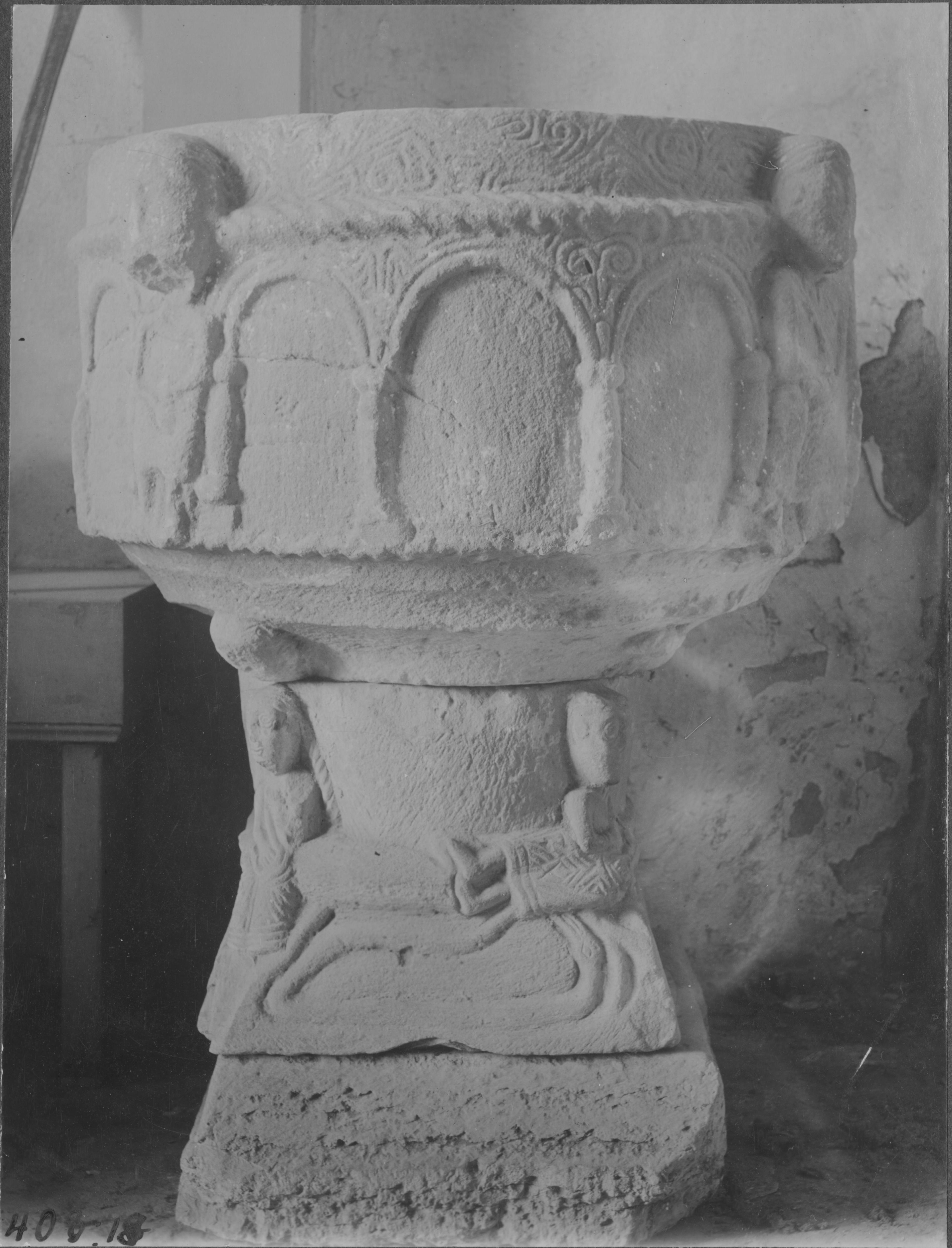 Beskrivning: Dopfunt av sandsten. Rundbågiga arkader och fyra hörnfigurer. Foten med hörnfigurer och drakar.