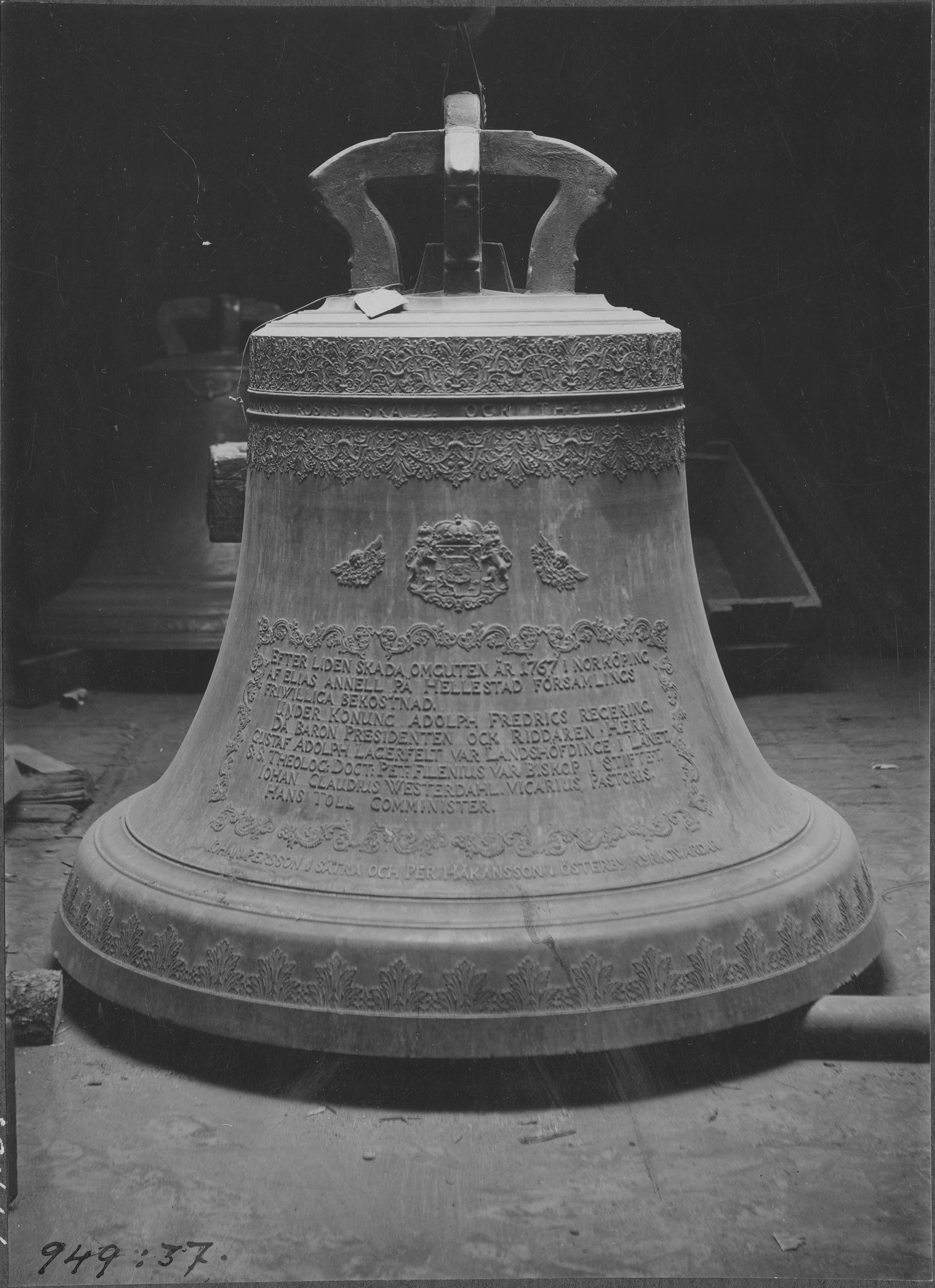Beskrivning: Storklockan. Enligt inskrift omgjuten 1767. Ornerad med Kristus som världsdomare, Paulus, Petrus och evangelister. Vikt 1182 kg. Diameter 130 cm, höjd 132 cm.