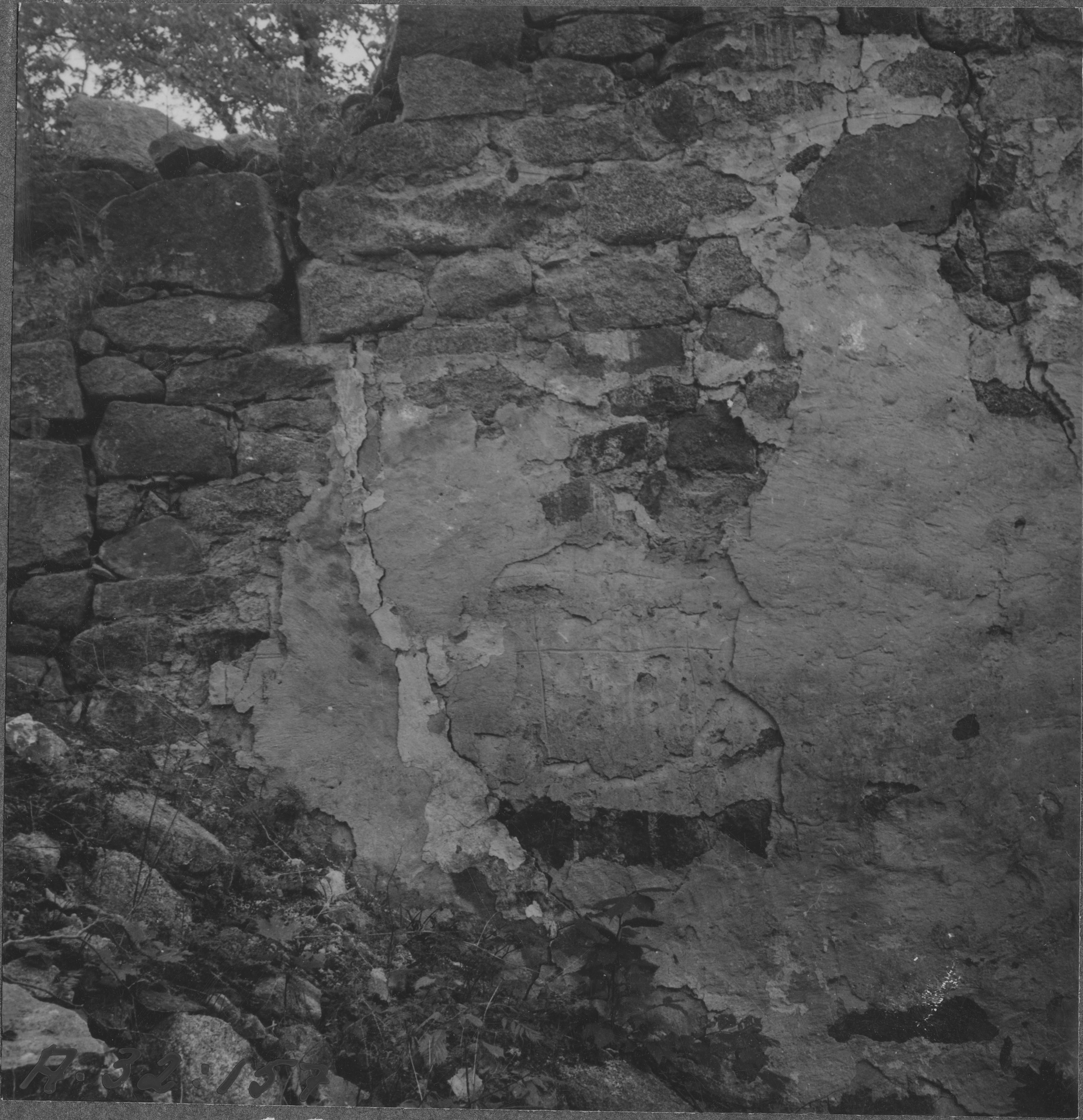 Beskrivning: Kvaderritsning på norra murens insida mellan fönstret och västra gaveln.