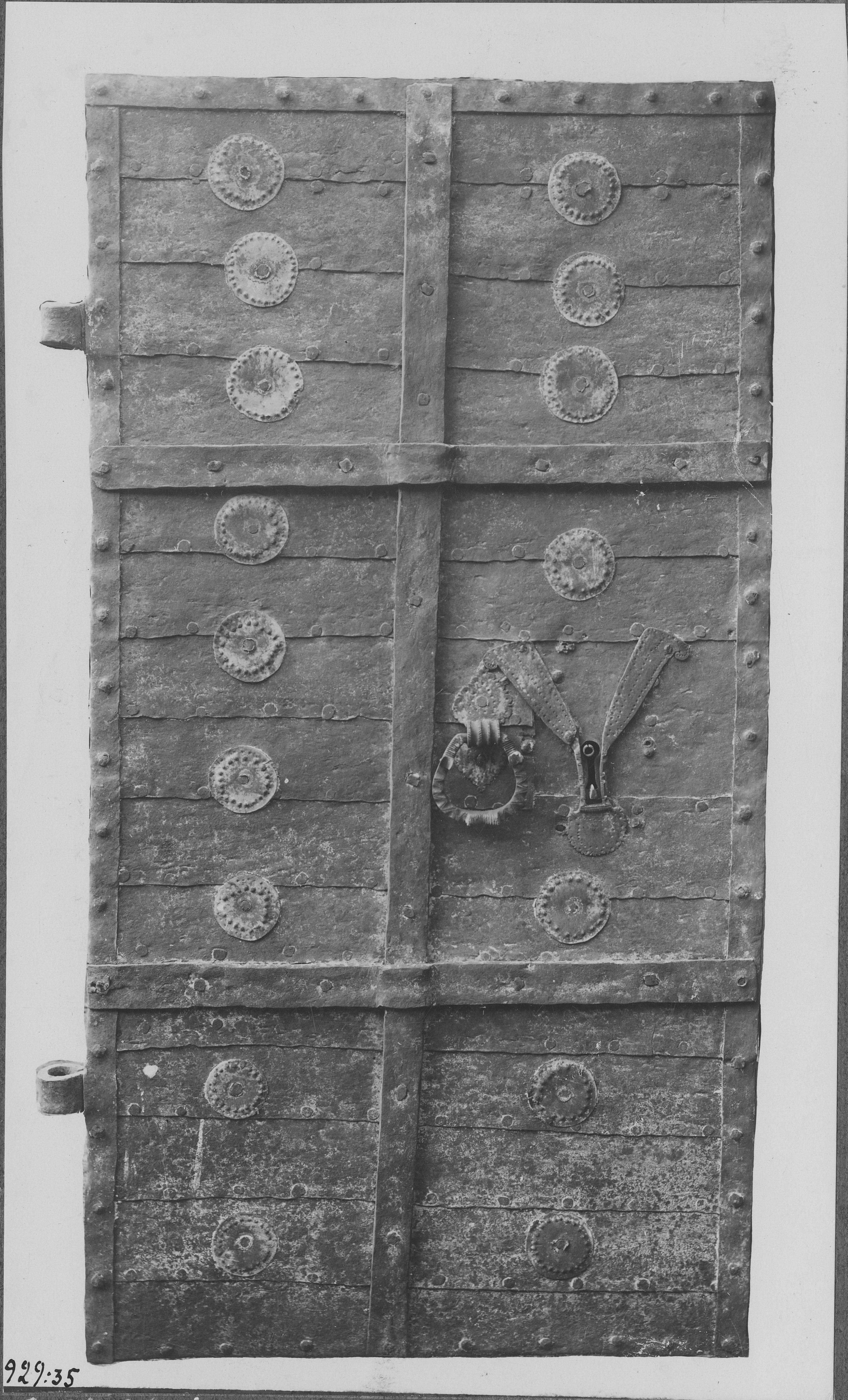 Beskrivning: Dörr av järnplåtar, nitade på klink. Järnbandad ring och lås. Runda putsade rosetter.