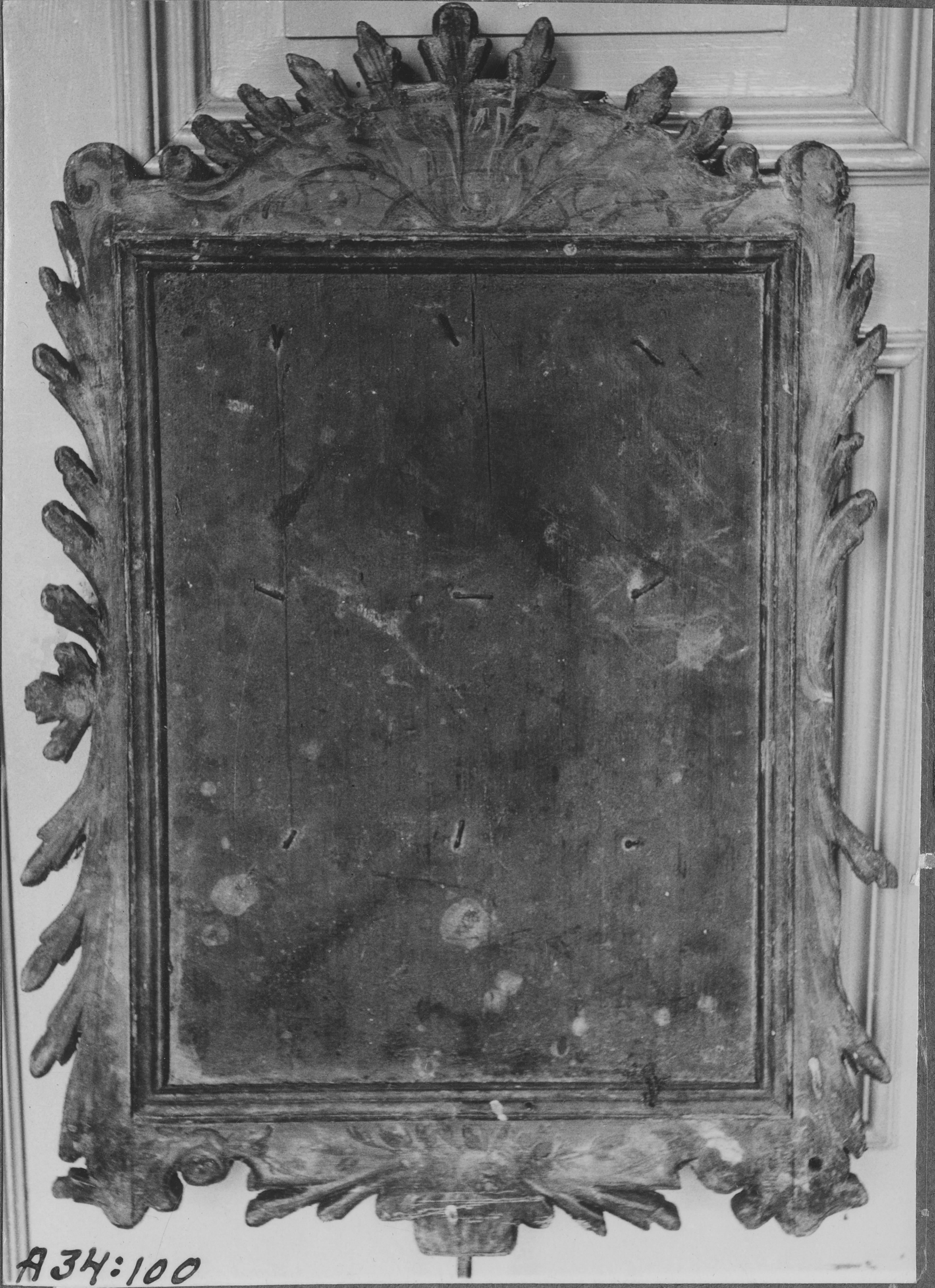 Beskrivning: Nummertavla av trä med utsågad ram och målade blommer. 1700-talet. Troligen från Högby gamla kyrka.