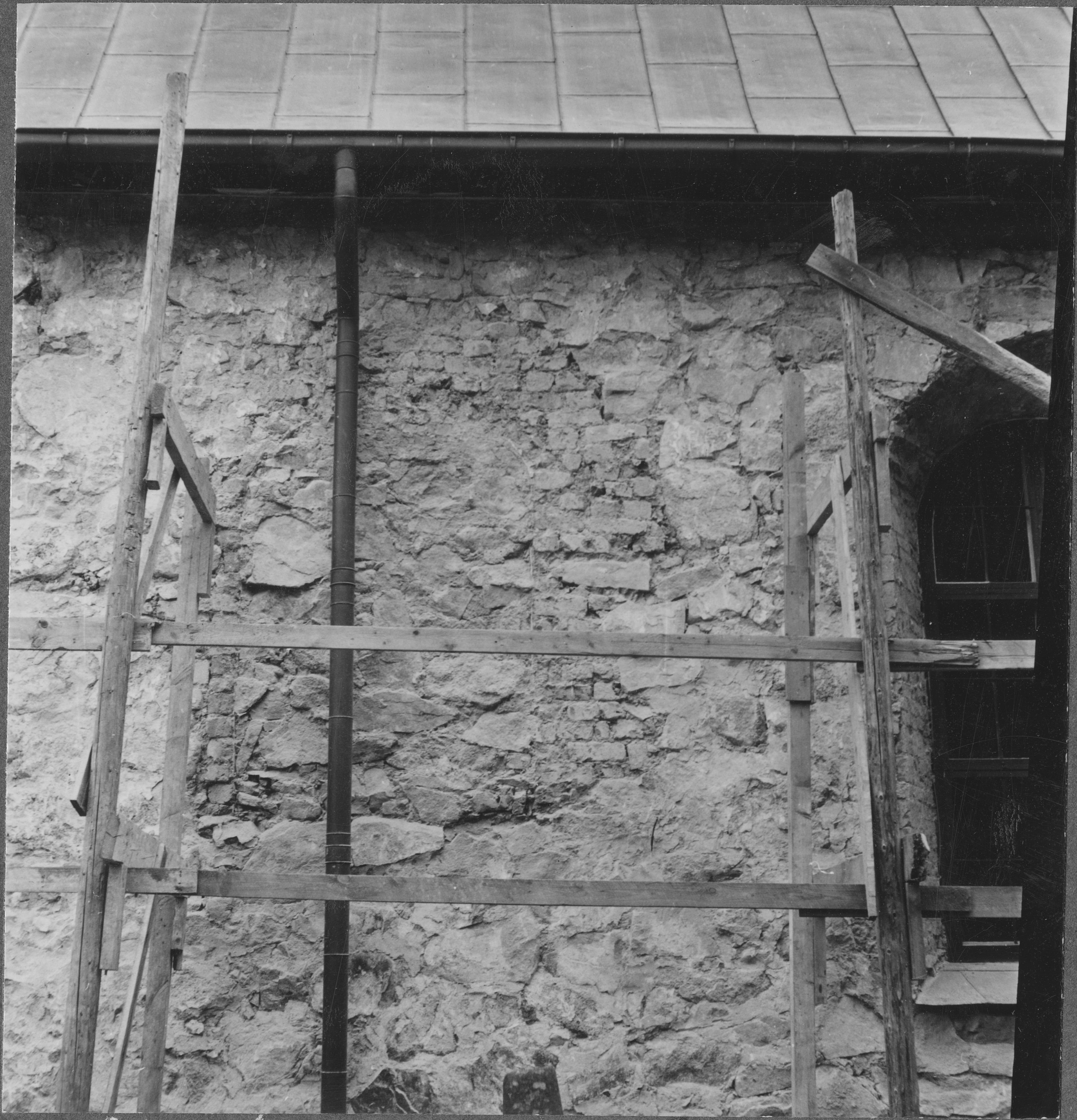 Beskrivning: Södra långhusmuren med igensatt fönster.