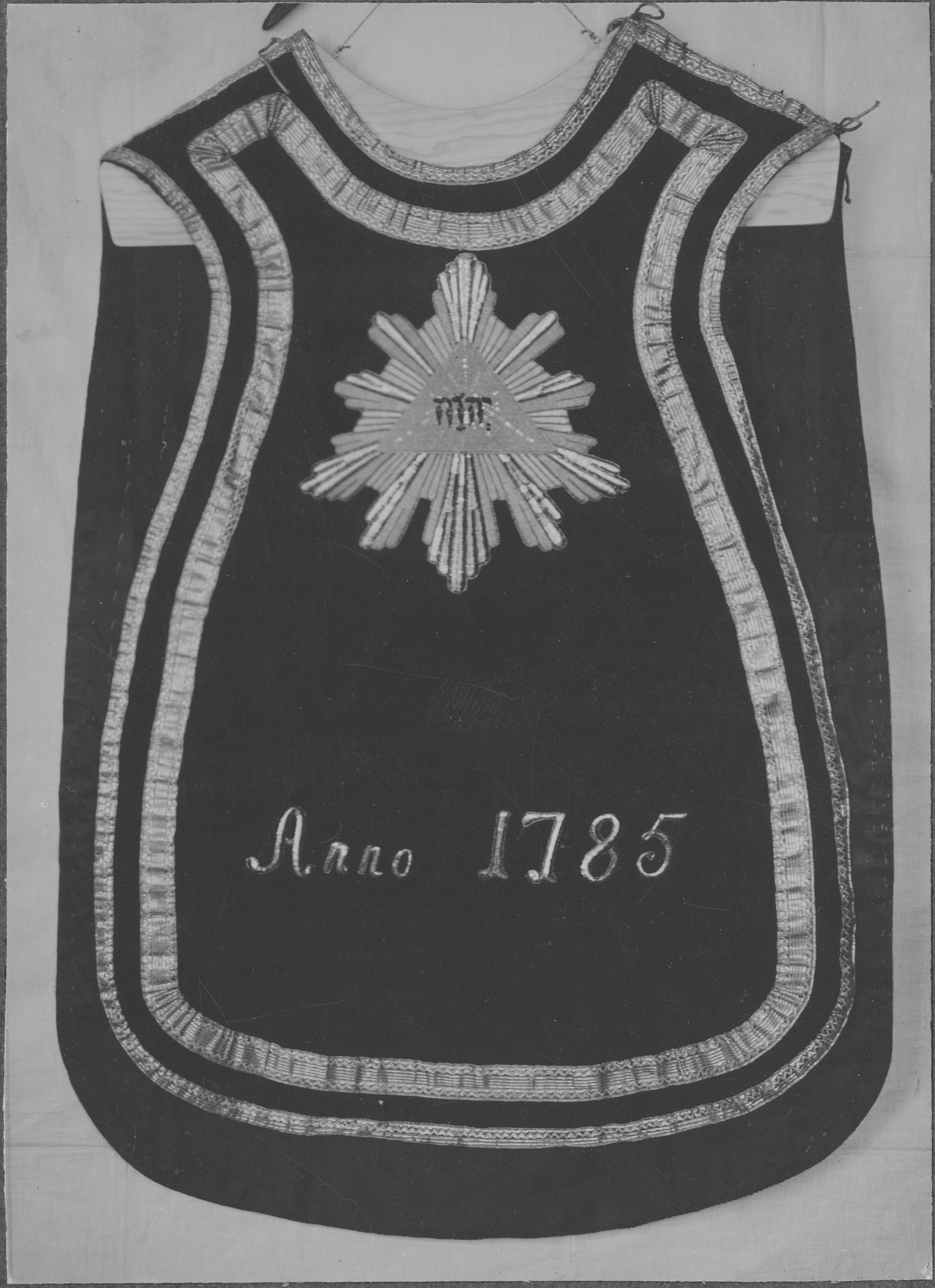 Beskrivning: Mässhake av röd sammet med gudsöga med texten Anno 1785.