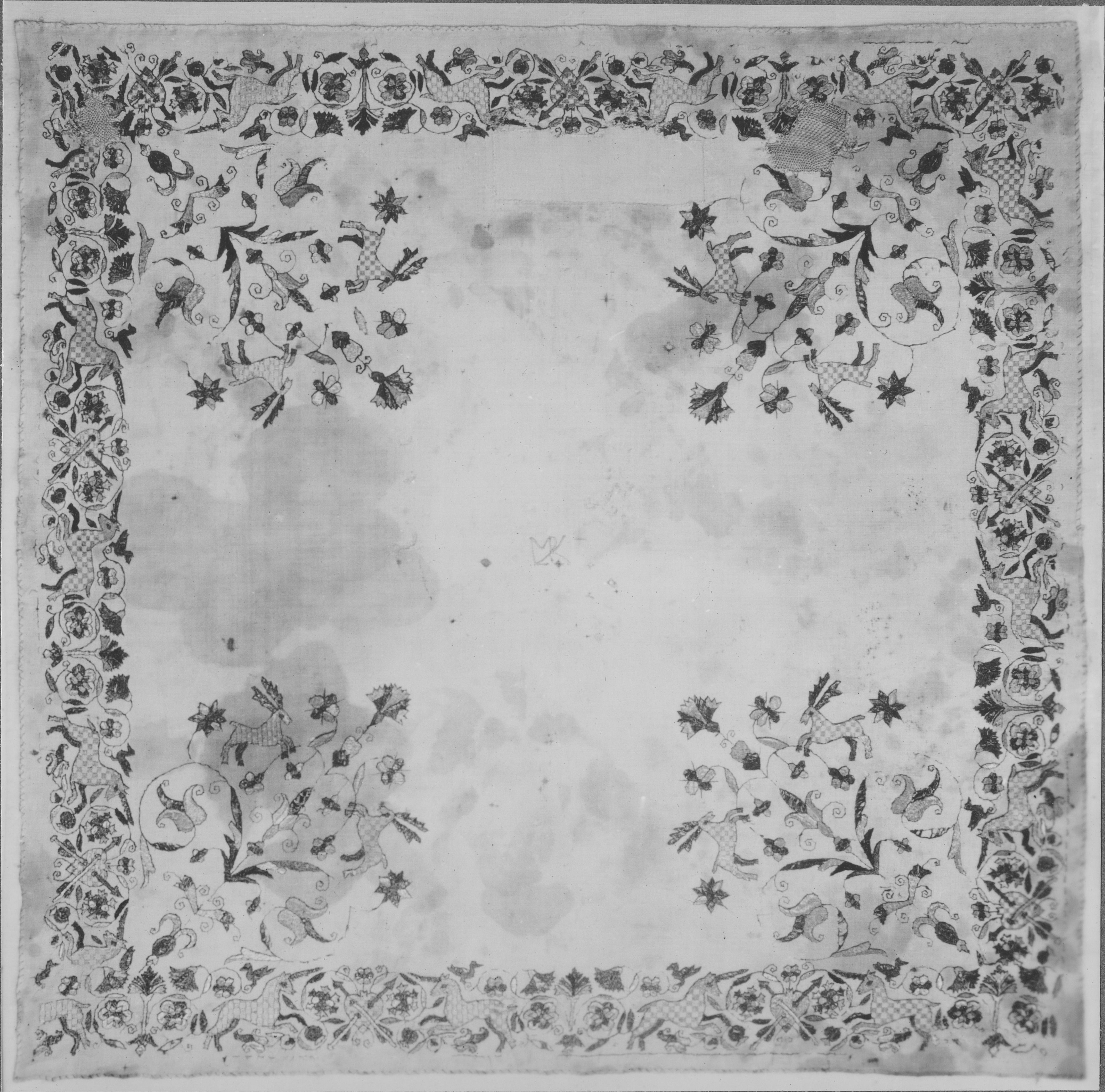 Beskrivning: Kalkduk av vitt linne med broderier av växter, enhörningar med mera. Efter konservering.