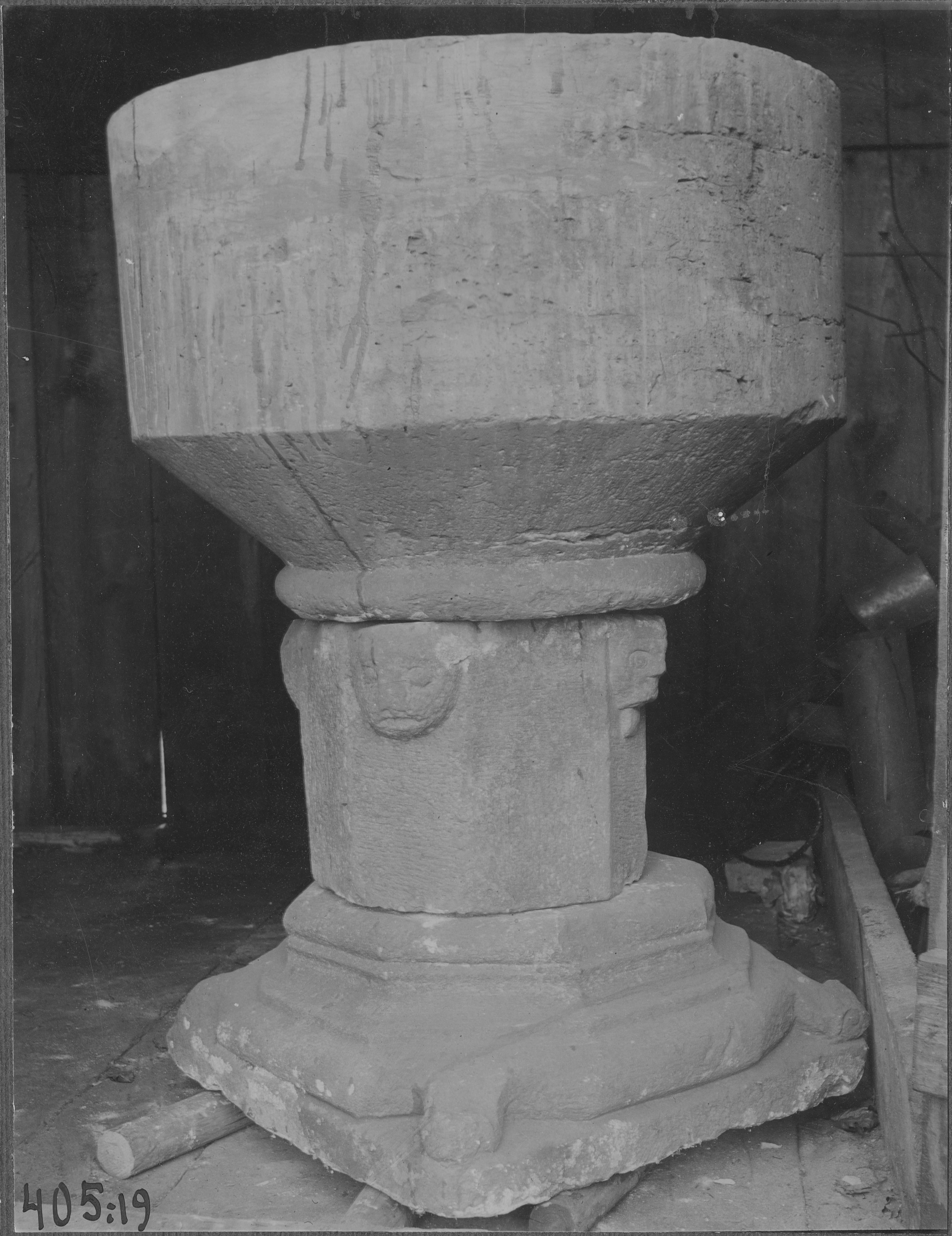 Beskrivning: Dopfunt av kalksten, sannolikt från 1400-talet.