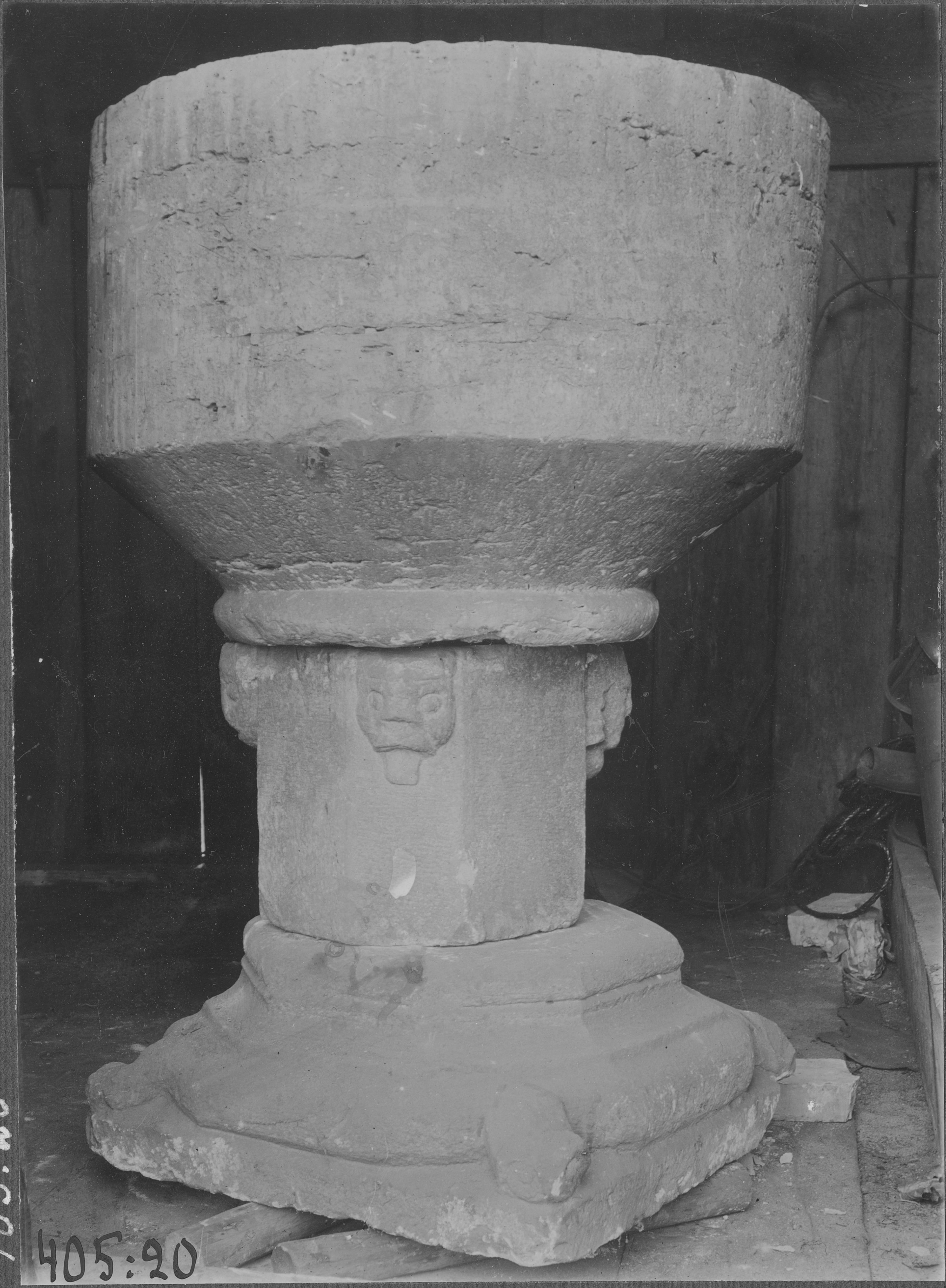 Beskrivning: Dopfunt av kalksten, sannolikt från 1400-talet.