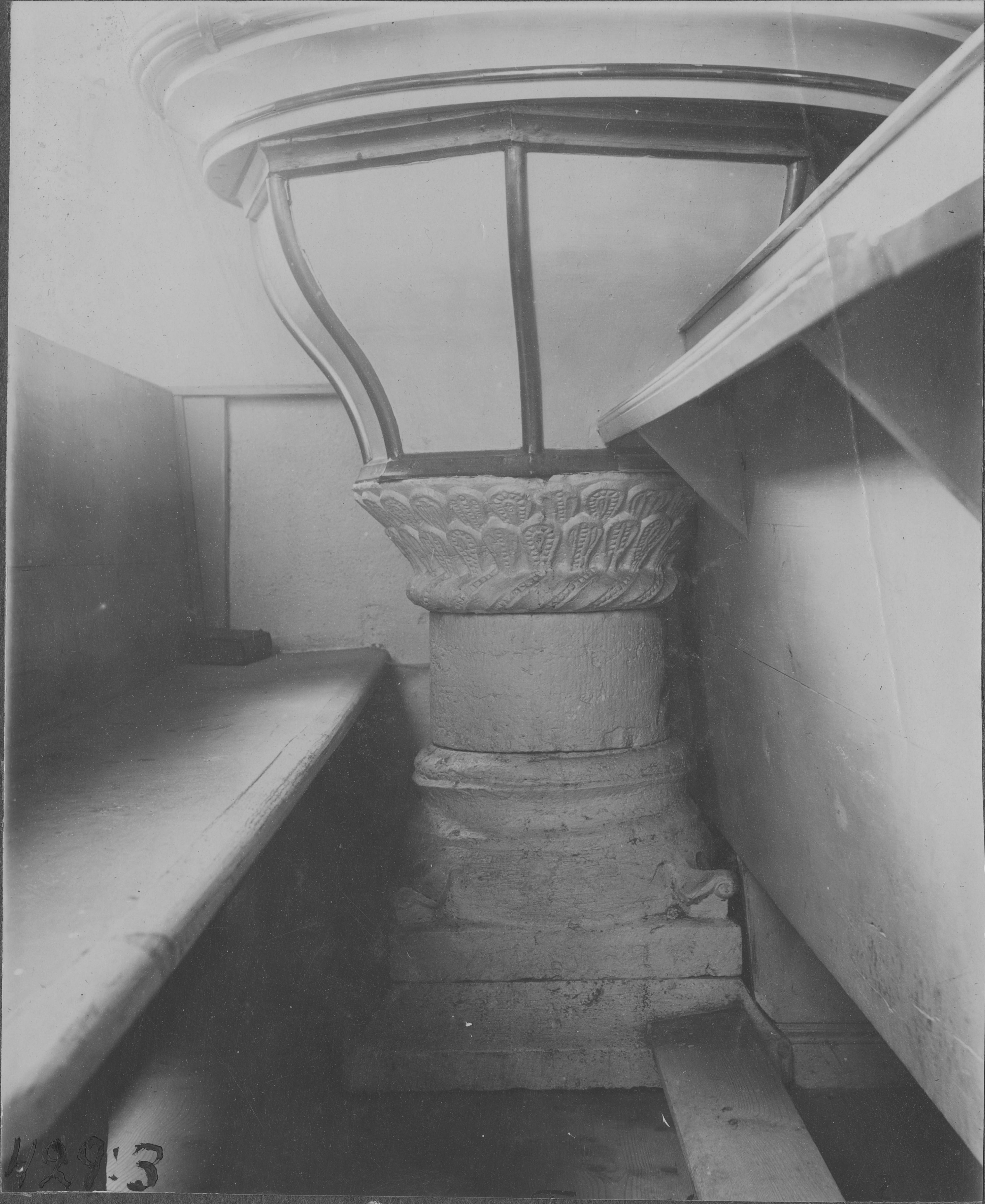 Beskrivning: Dopfuntsfot av kalksten, troligen från 1200-talets mitt. Används som fot till predikstolen.