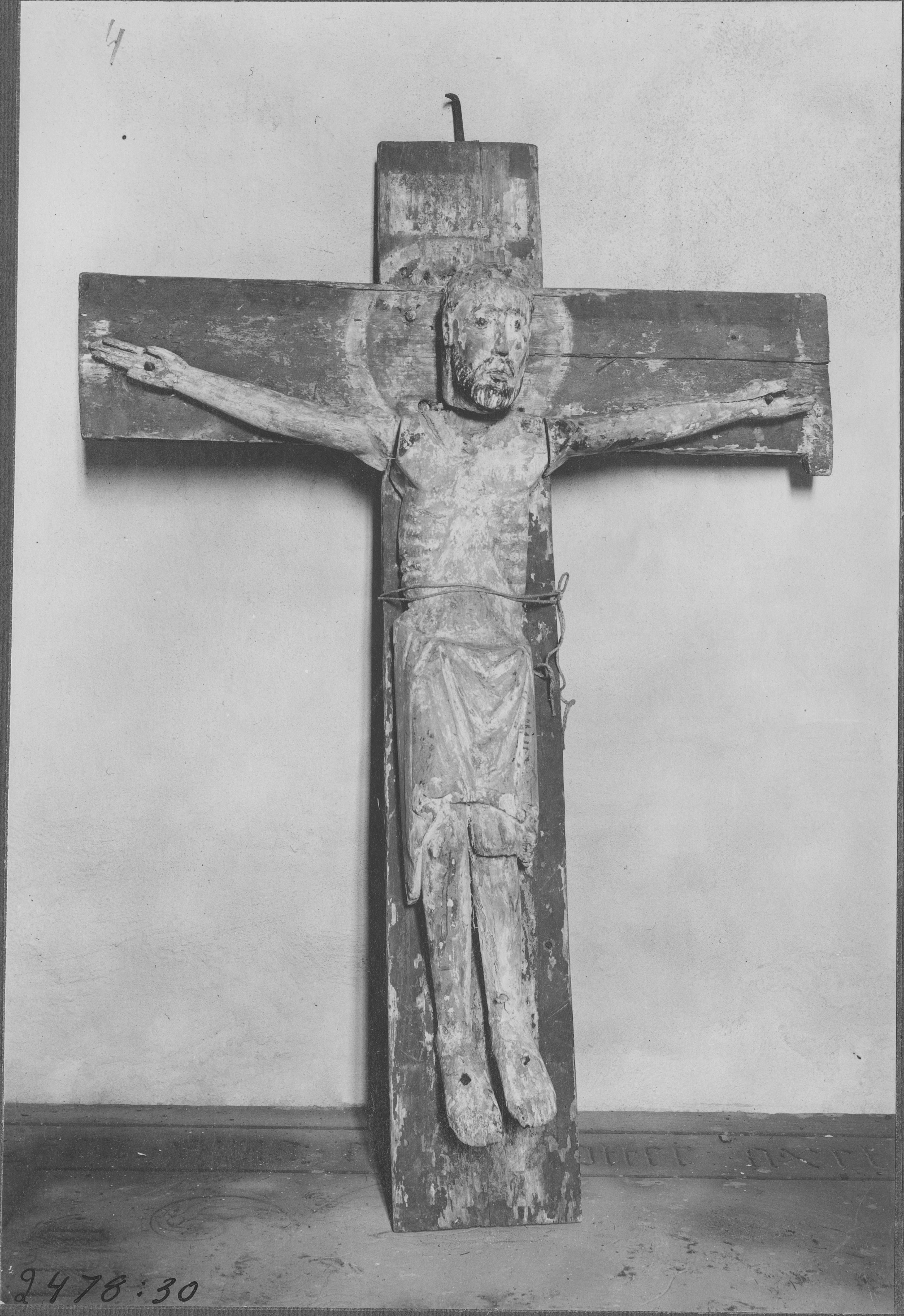 Beskrivning: Krucifix av trä. Yngre medeltiden. Före restaurering.