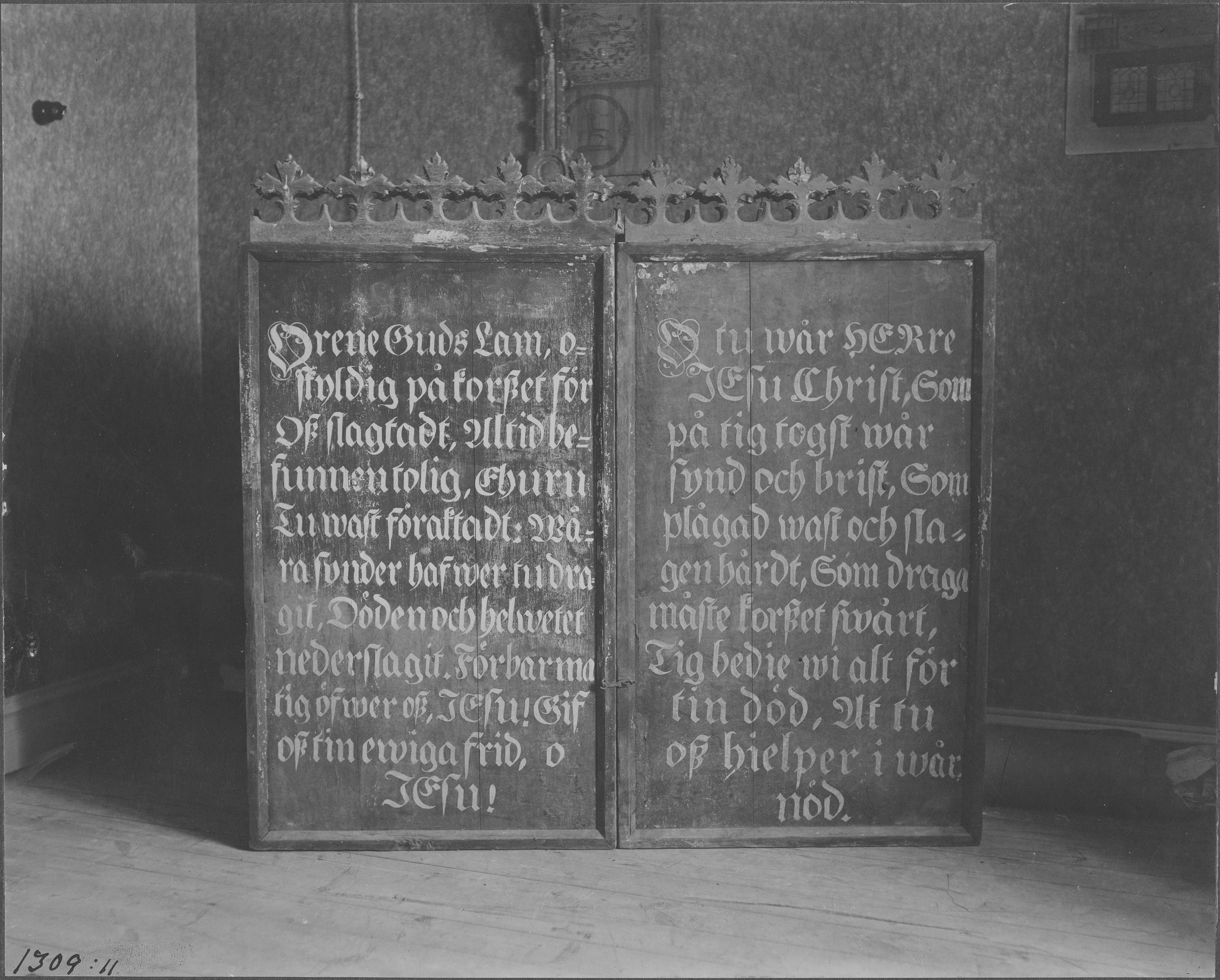 Beskrivning: Altarskåp av trä. Utvändigt före restaurering. Nordtyskt arbete från 1400-talet slut.