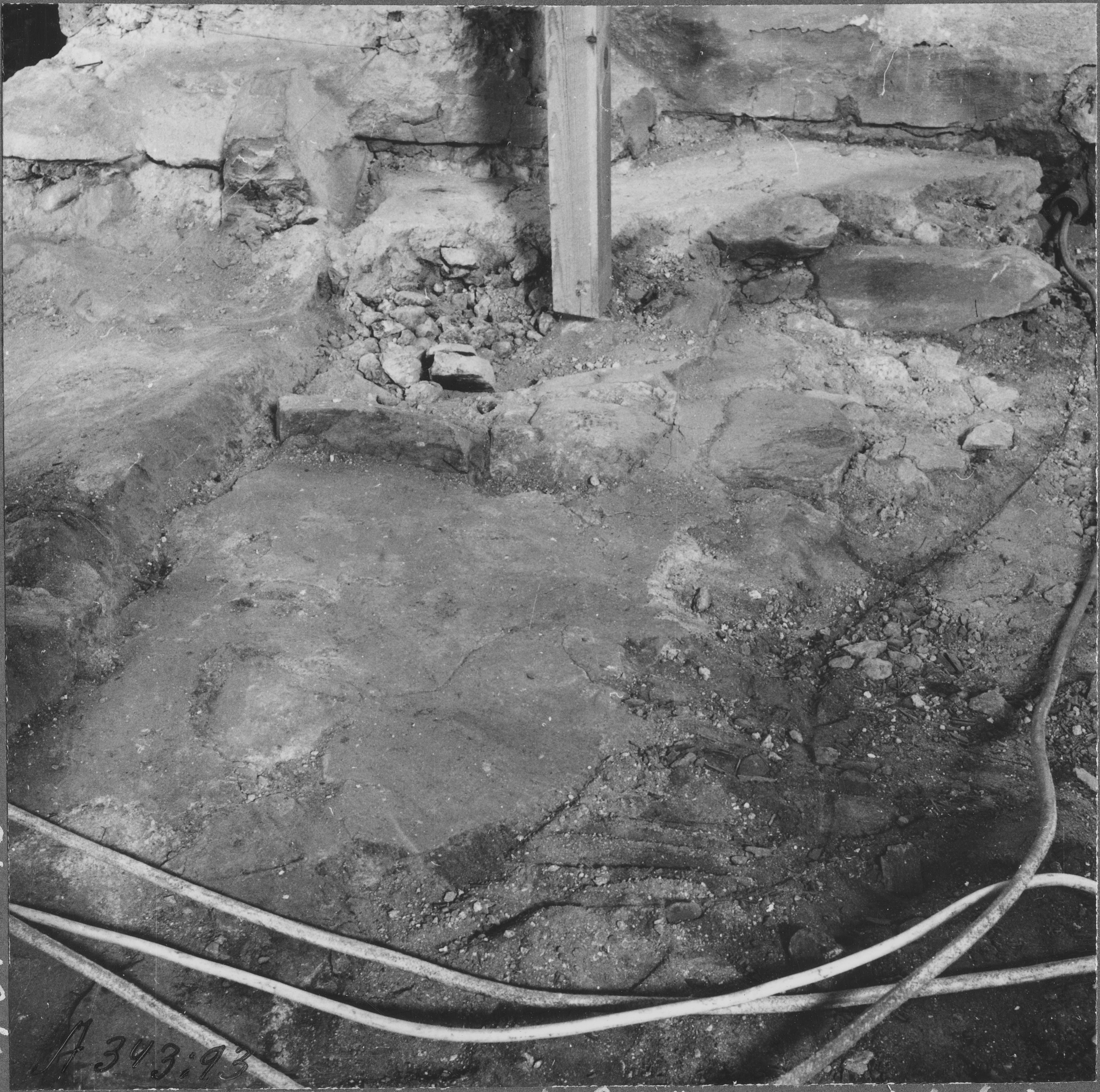 Beskrivning: Golvrest i korets nordvästra hörn, invid triumfbågens grundsula.