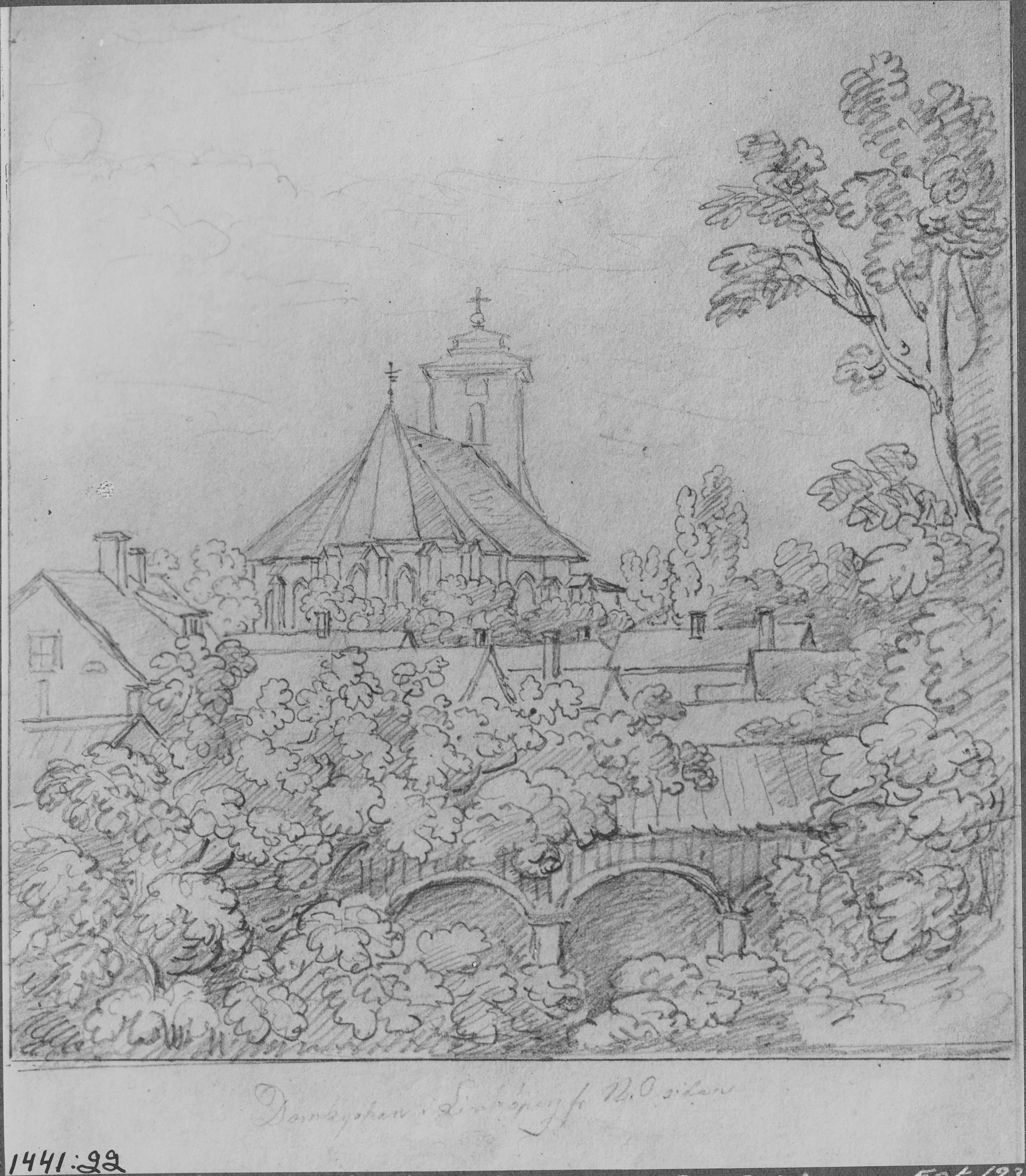 Beskrivning: Kyrkan från nordost. Efter blyertsteckning av D. W. Blom. Ägare Signe Sernander.