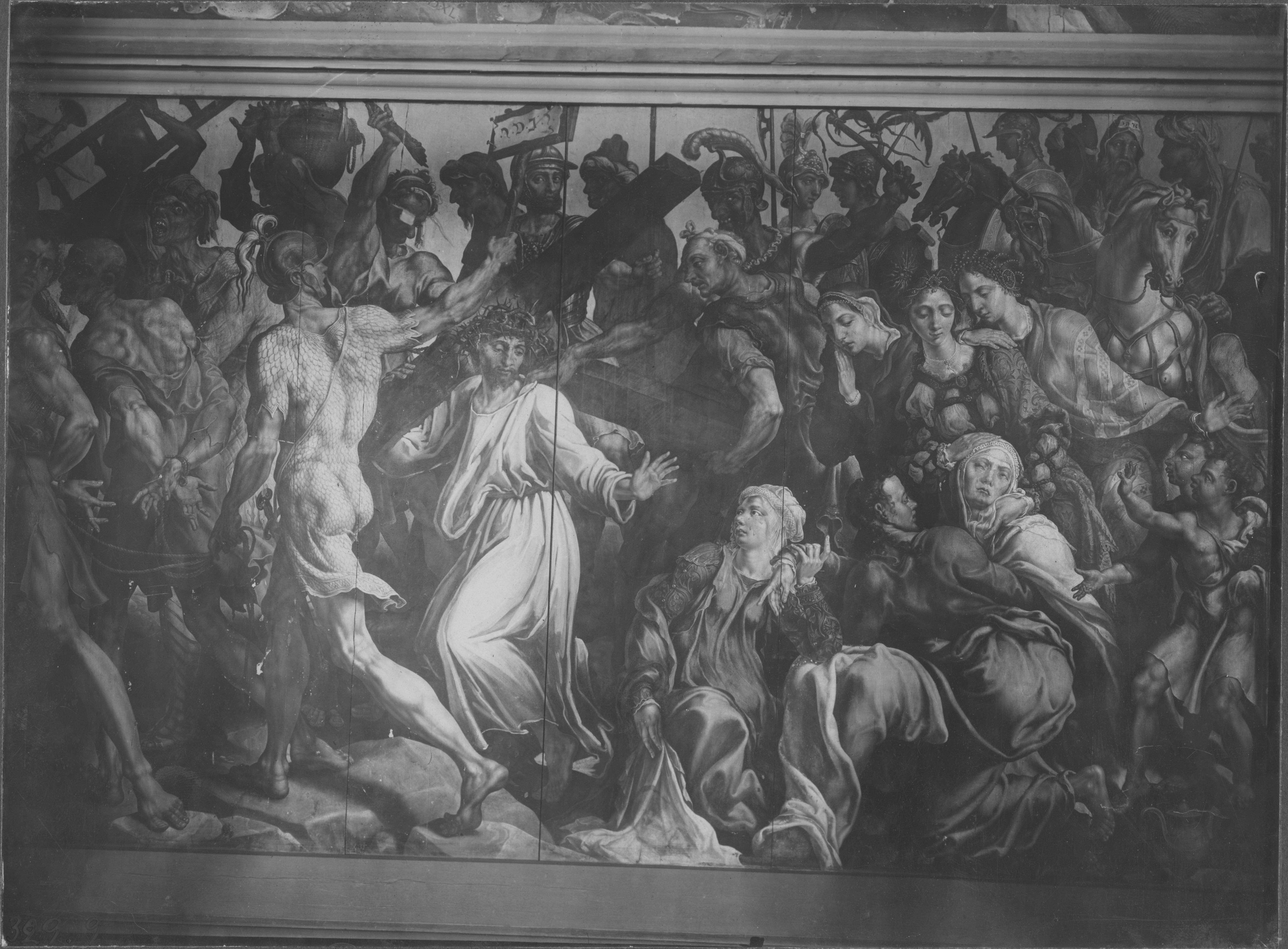 Beskrivning: Altarskåp av ek, krederat och målat, detalj. Av Maerten van Heemskerck 1538-1543. Före konservering.
