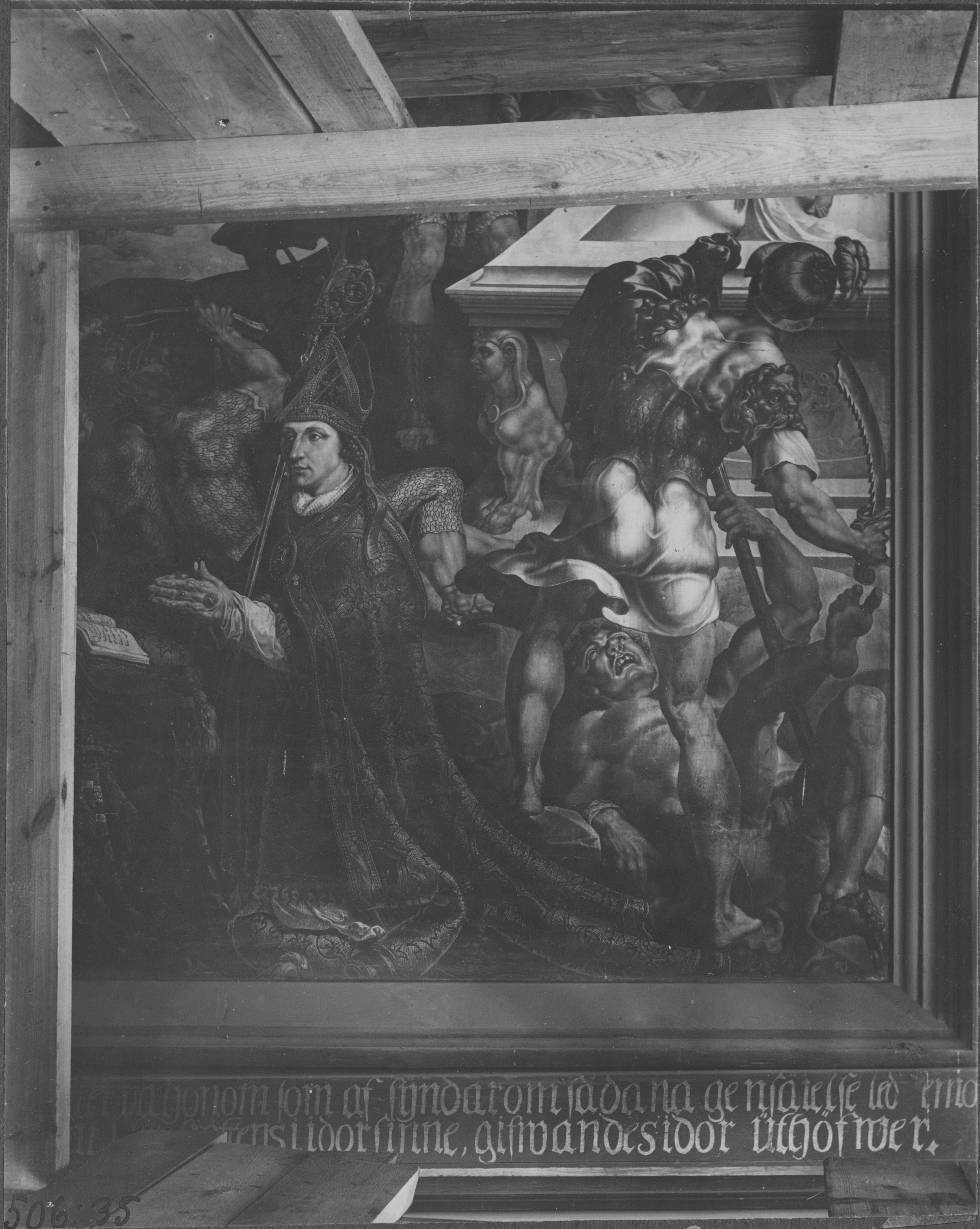 Beskrivning: Altarskåp av ek, krederat och målat, detalj. Av Maerten van Heemskerck 1538-1543. Före konservering.