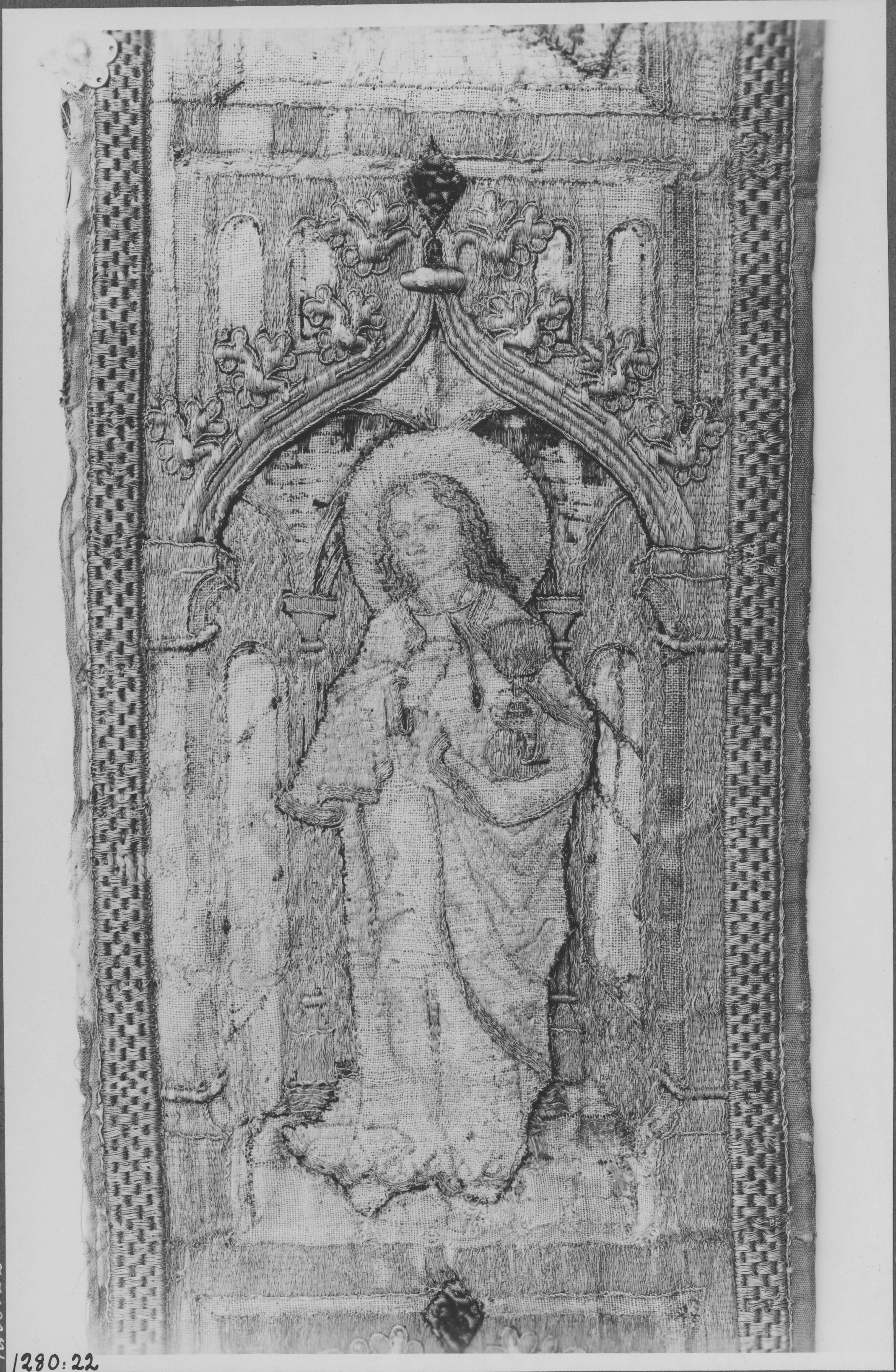 Beskrivning: Korkåpebräm, broderat, detalj. Senmedeltid-1500-tal. Textilutställningen i Stockholm 1929. Nummer 122.