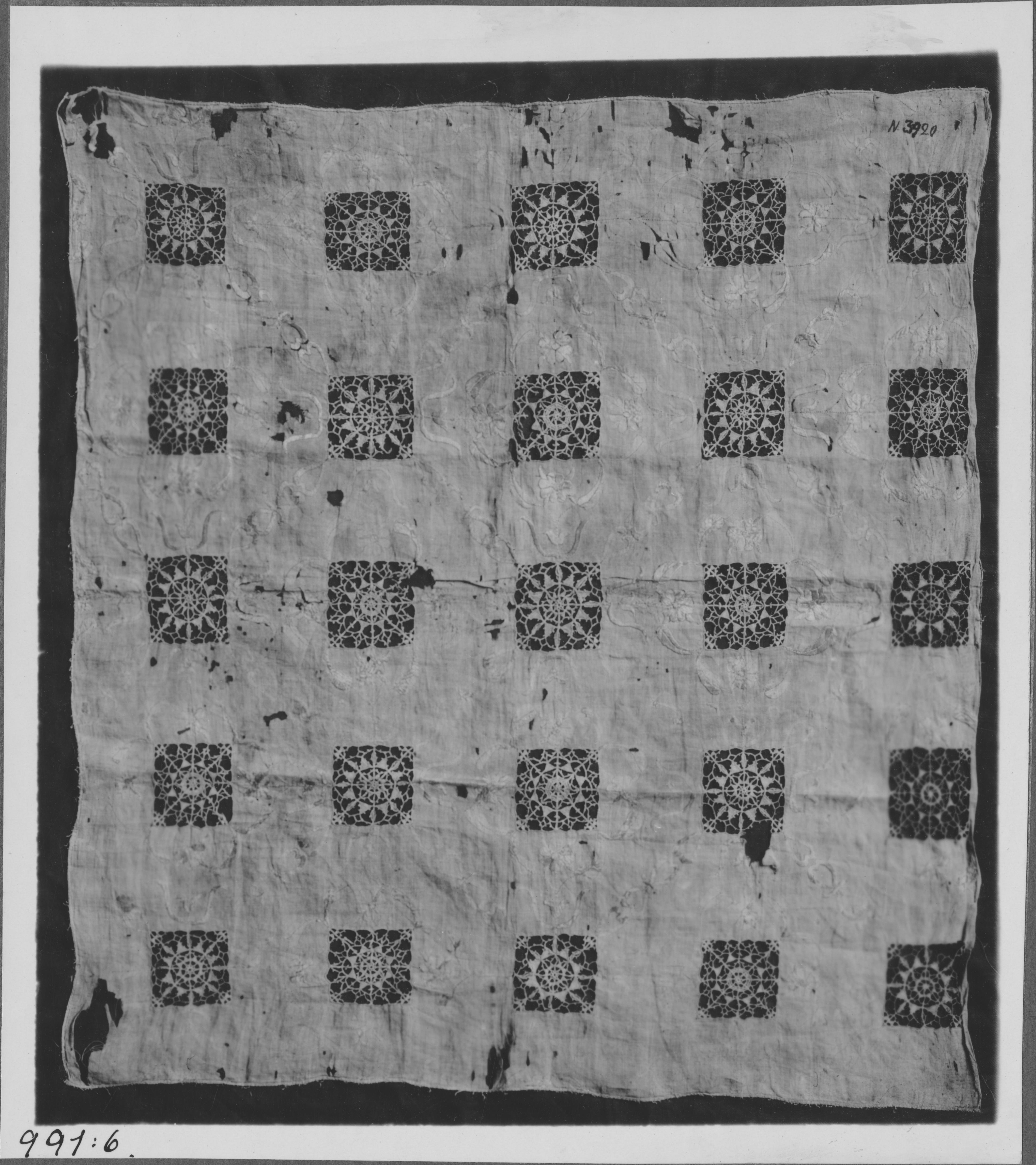 Beskrivning: Kalkduk. Linnekammarduk med silke- och guldbroderi. Sannolkit 1600-talets förra hälft.