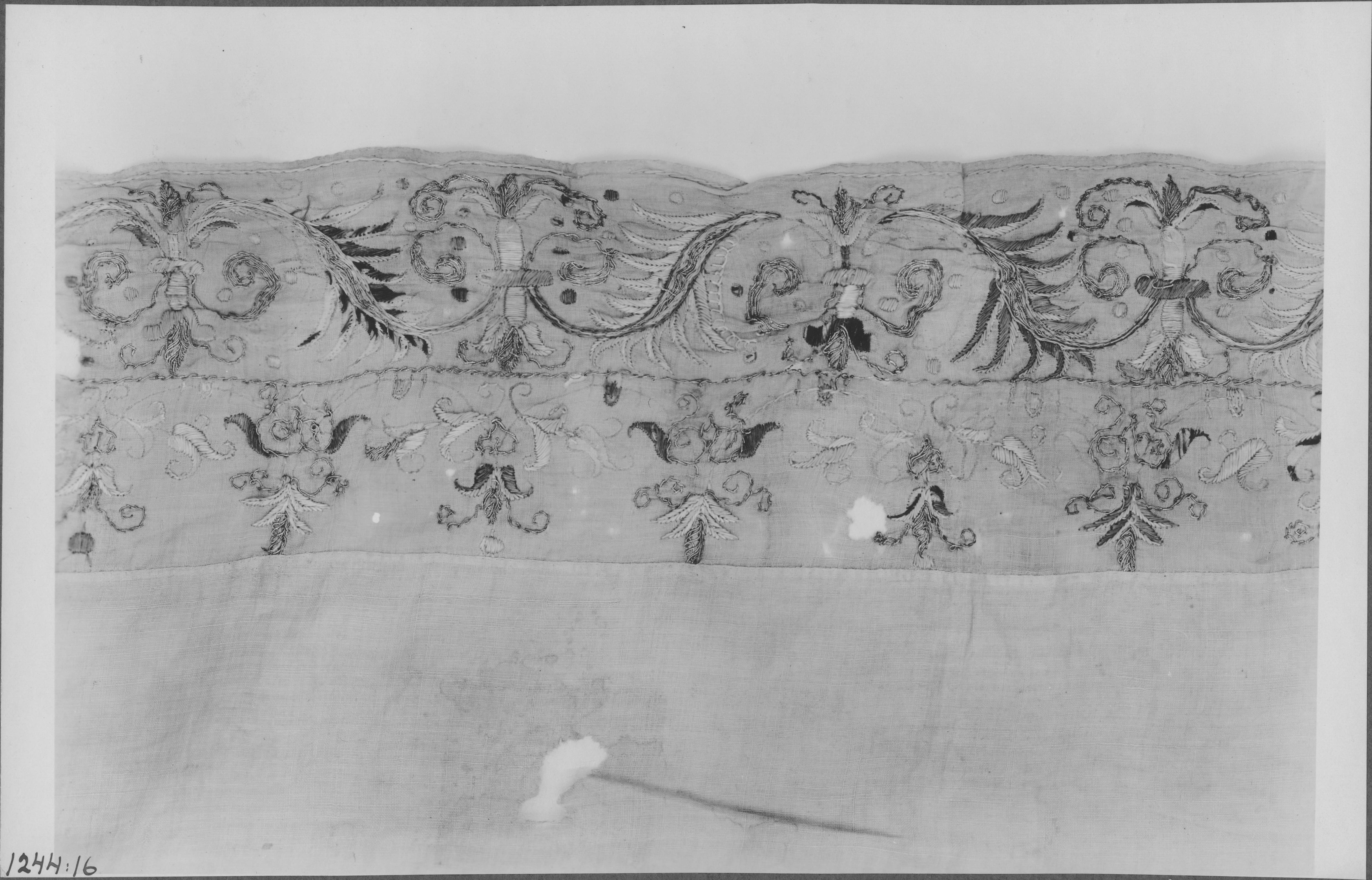 Beskrivning: Kalkduk. Vit linnekammarduk med guld- och silkebroderi. Gåva 1618 från Sturefors. Textilutställningen Stockholm 1929. Nummer 375.