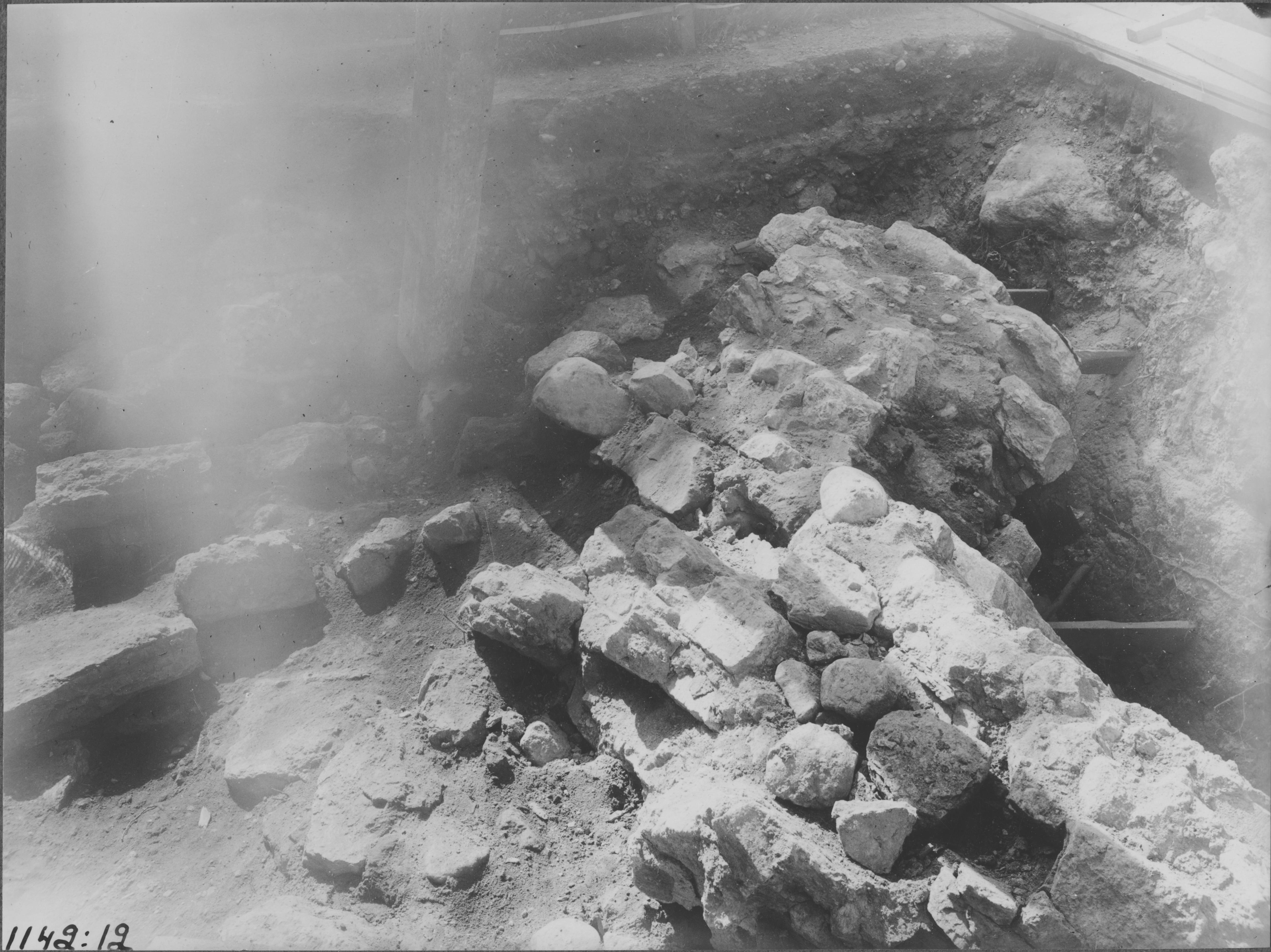 Beskrivning: Nedrasade murpartier söder om södra långhusportalen.