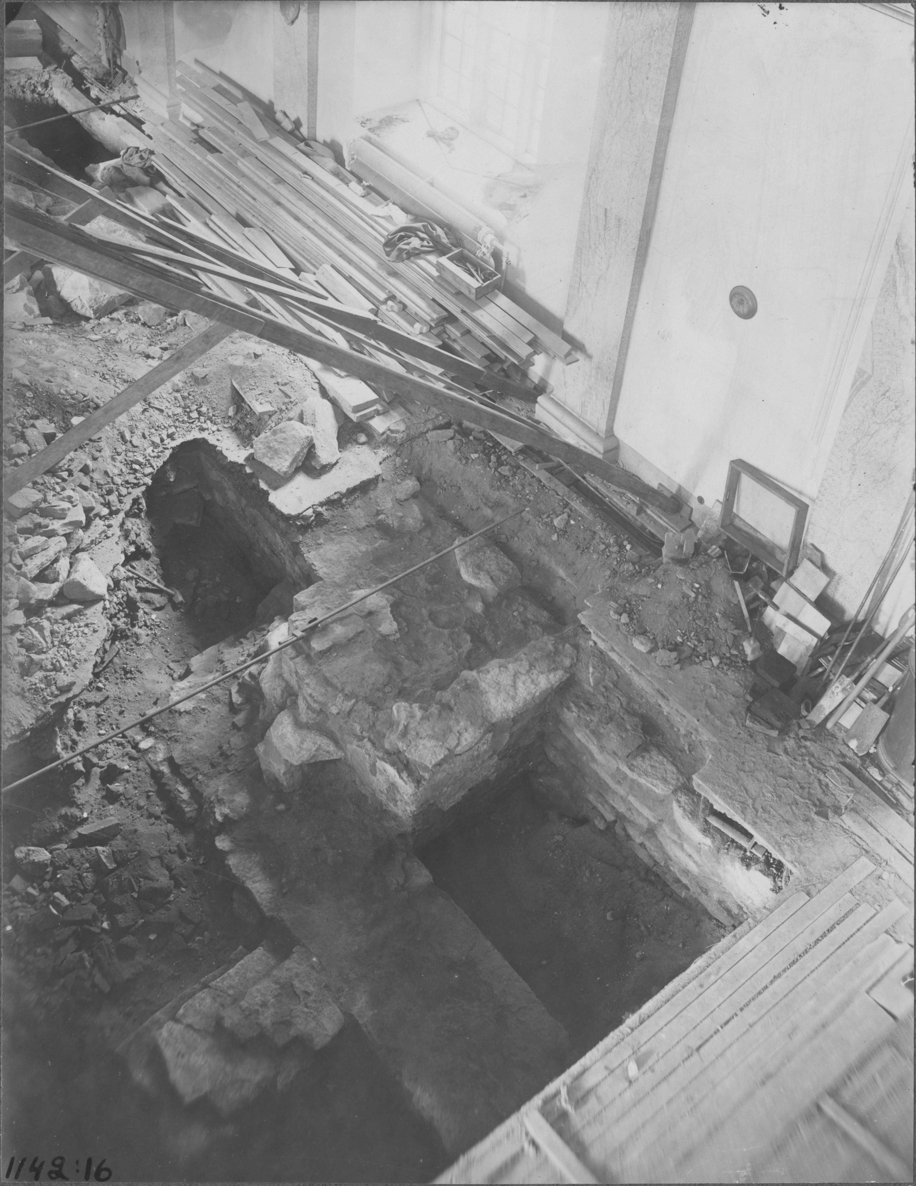 Beskrivning: Hörnet av 1100-talskyrkans norra långhusmur, östra gavel och norra kormur.