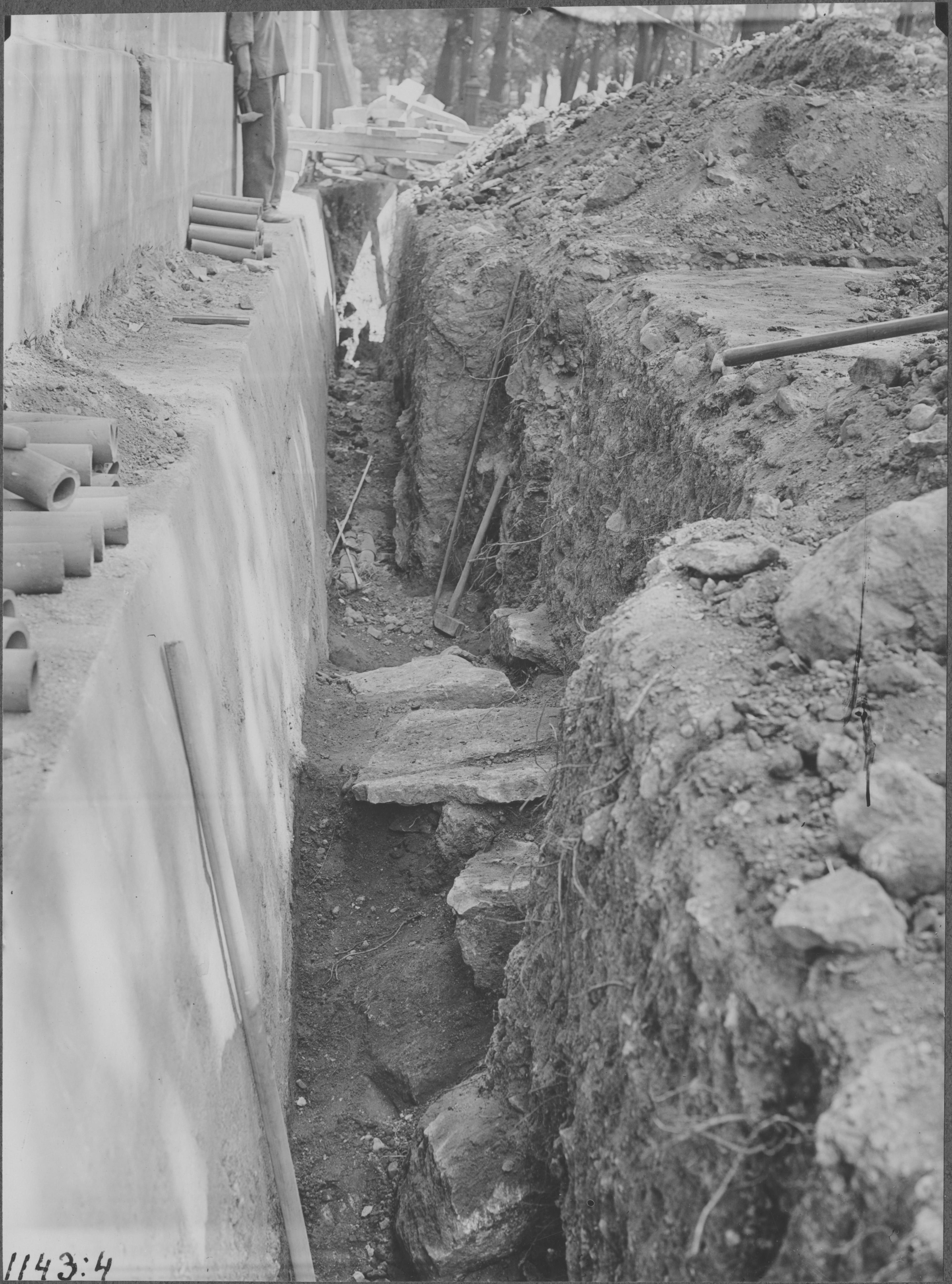 Beskrivning: Medeltidsgrav invid 1100-talskyrkans södra långhusmur, täckta av hällar.