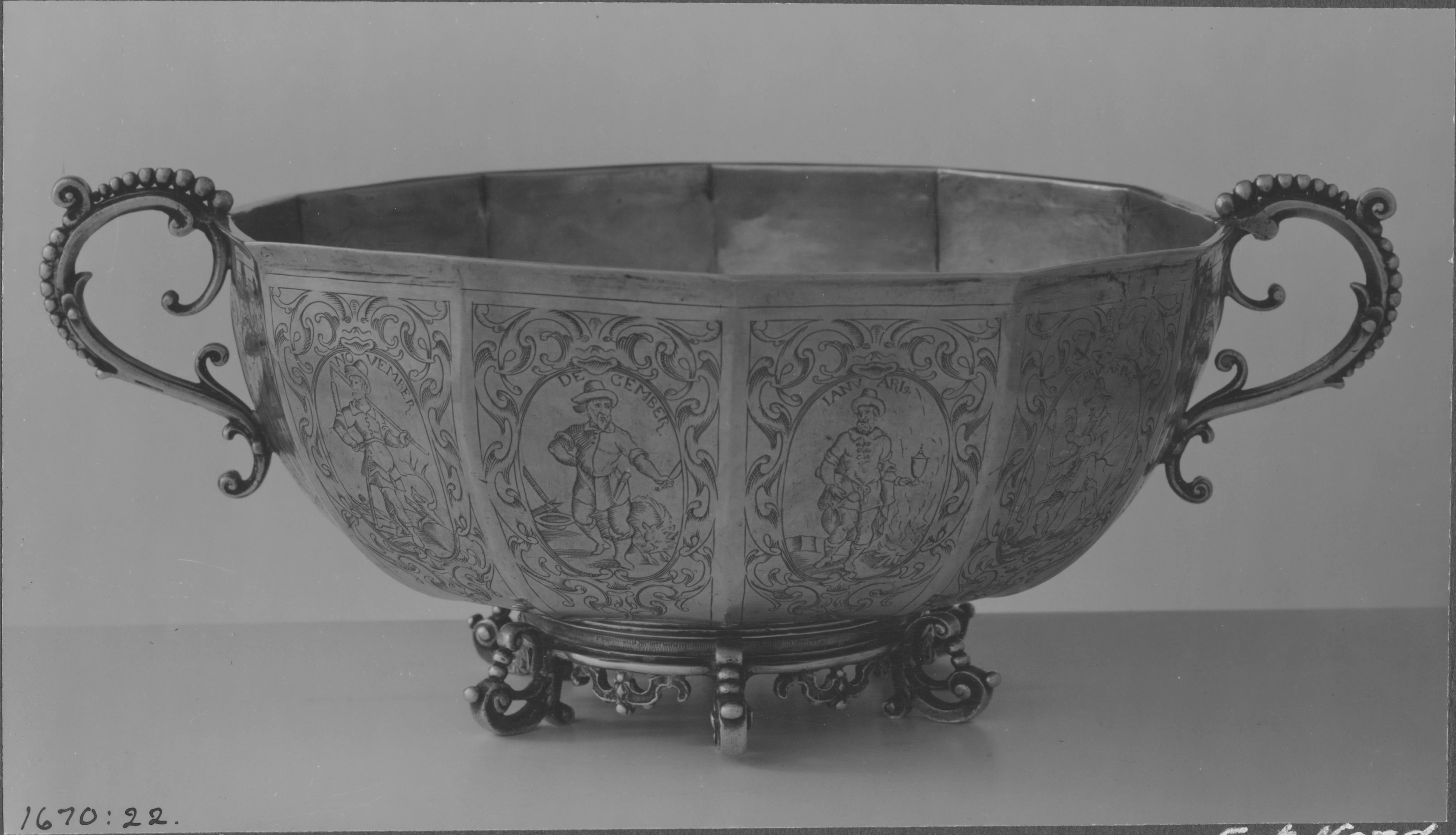 Beskrivning: Dopskål av silver. 12-kantig. Ornerad i ristat arbete med manliga figurer personifierade de tolv månaderna. På bottens insida en medaljong med drottning Kristinas bild. På undersidan Kristus med världsklotet med inskrift: Salvator Mundi Salva nos MDCXLVII. Gustav Adolfsutställningen 1932, nr 1430.